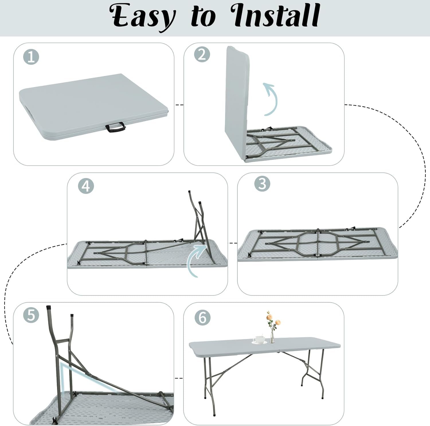 - No Assembly Required: It ready to use when you receive it, no assembly required, easy to set up or folded down in seconds, first open the table, then lock the legs in place, last stand it up and ready to use! The folding picnic table provide large space to comfortably accommodate 6-8 people. The safety lock prevent it from arching when in use, the sturdy steel frame prevent the table from collapsing, and provide reliable stability, ensure the table secure in any setting.