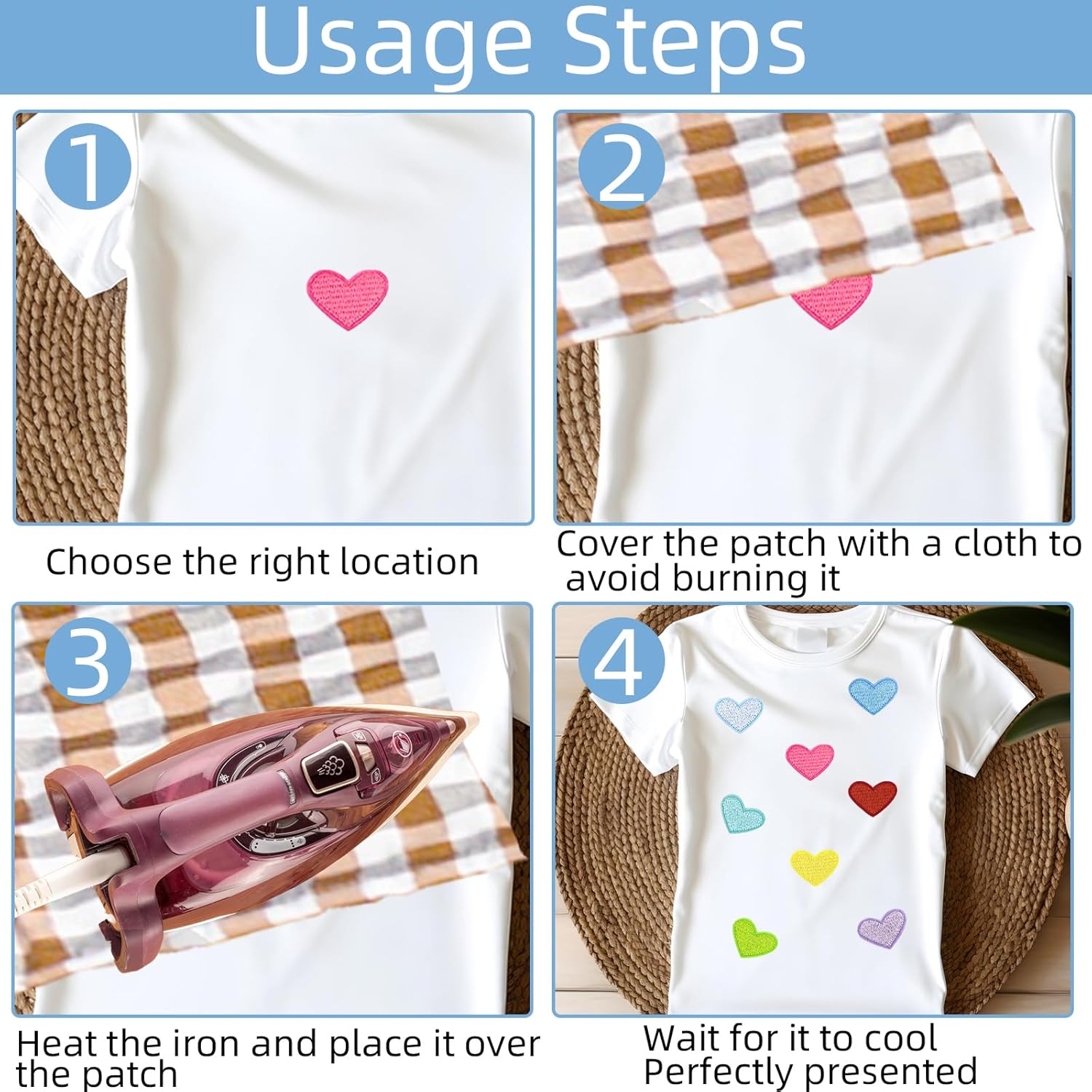 - 【Easy to Use】When using heart patches sew on,first choose a suitable position on the fabric.Then cover iron on appliques heart with a piece of cloth to prevent direct iron damage.Next,place the heated iron on onto the covered small heart patches iron on and press down gently.Finally, allow heart iron on patch to cool completely to ensure it adheres firmly to the fabric