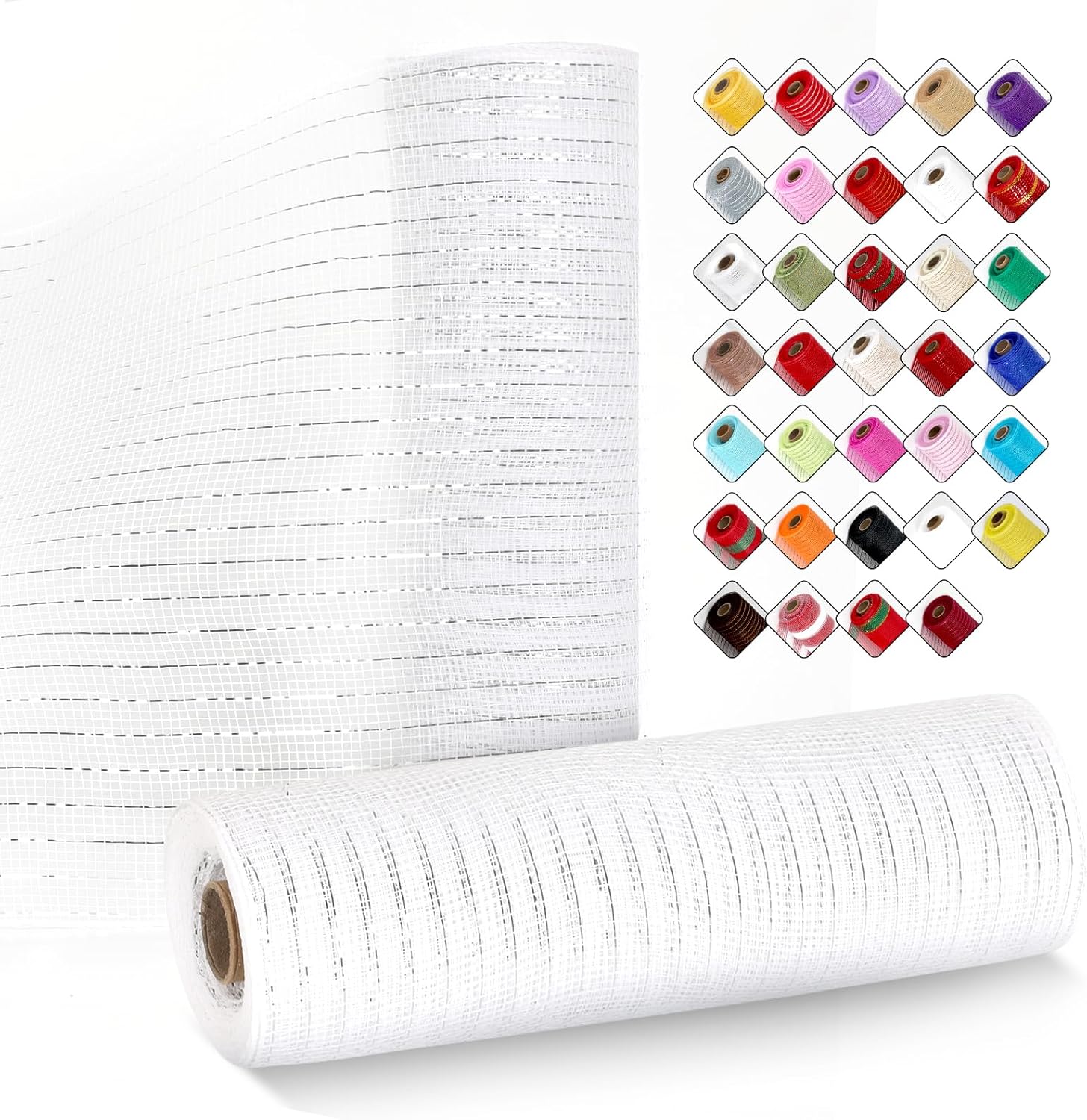2 Rolls Mesh Ribbon for Wreaths 10 Inch x 30 Foot Wreath Mesh Rolls with Metallic Foil for Easter Christmas Party Wedding Home Decor DIY Craft Projects and Gift Wrapping (White/Sliver)