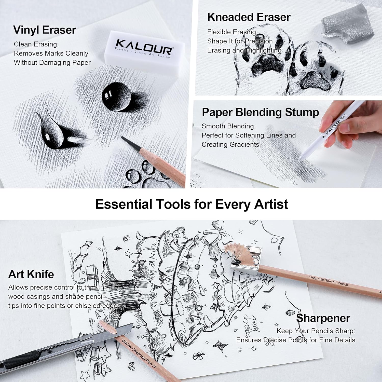 - Essential Erasers & Tools: Comes with a vinyl eraser, kneaded eraser for smudging control, blending stumps for smooth gradients, art knife for sharpening, and a sharpener for convenience.