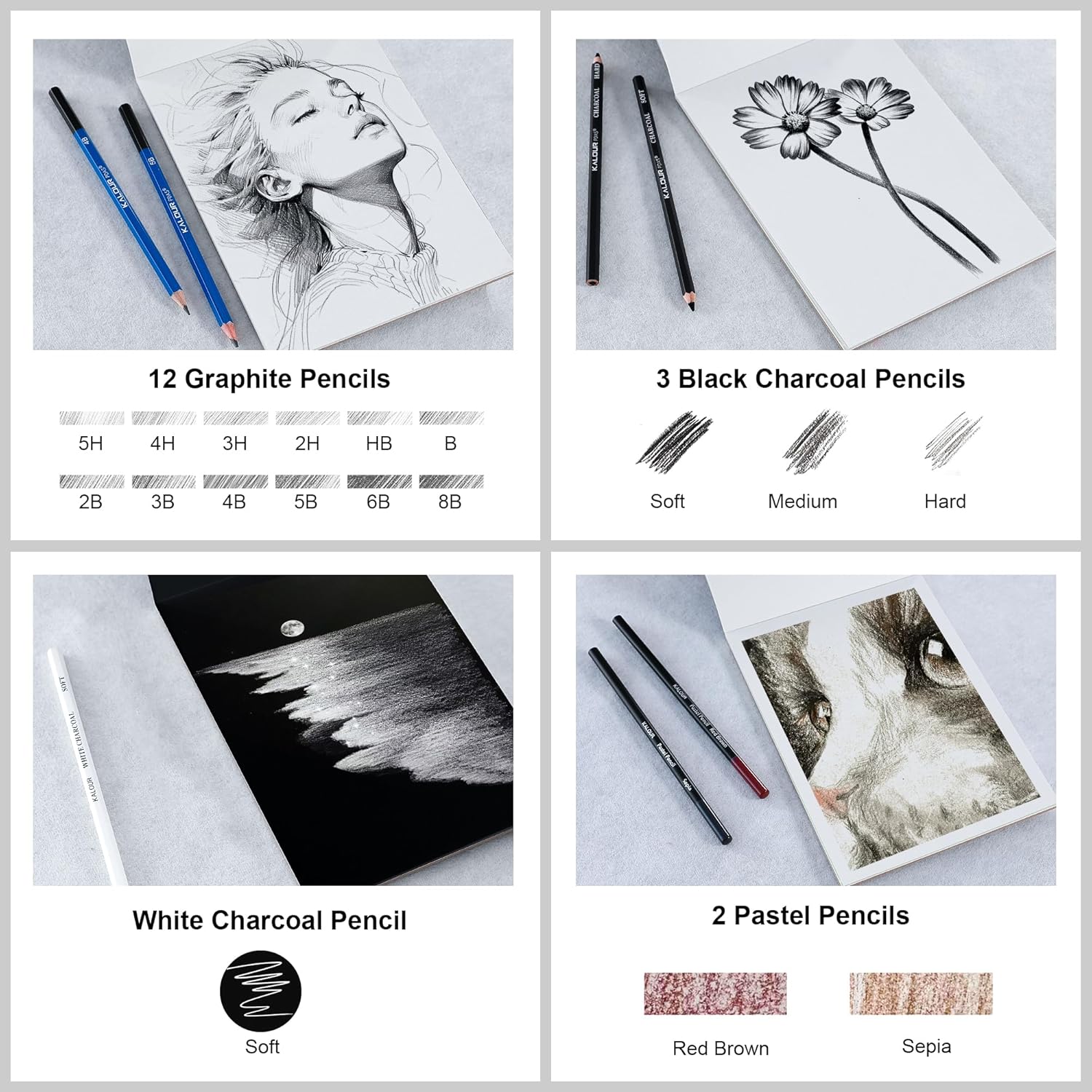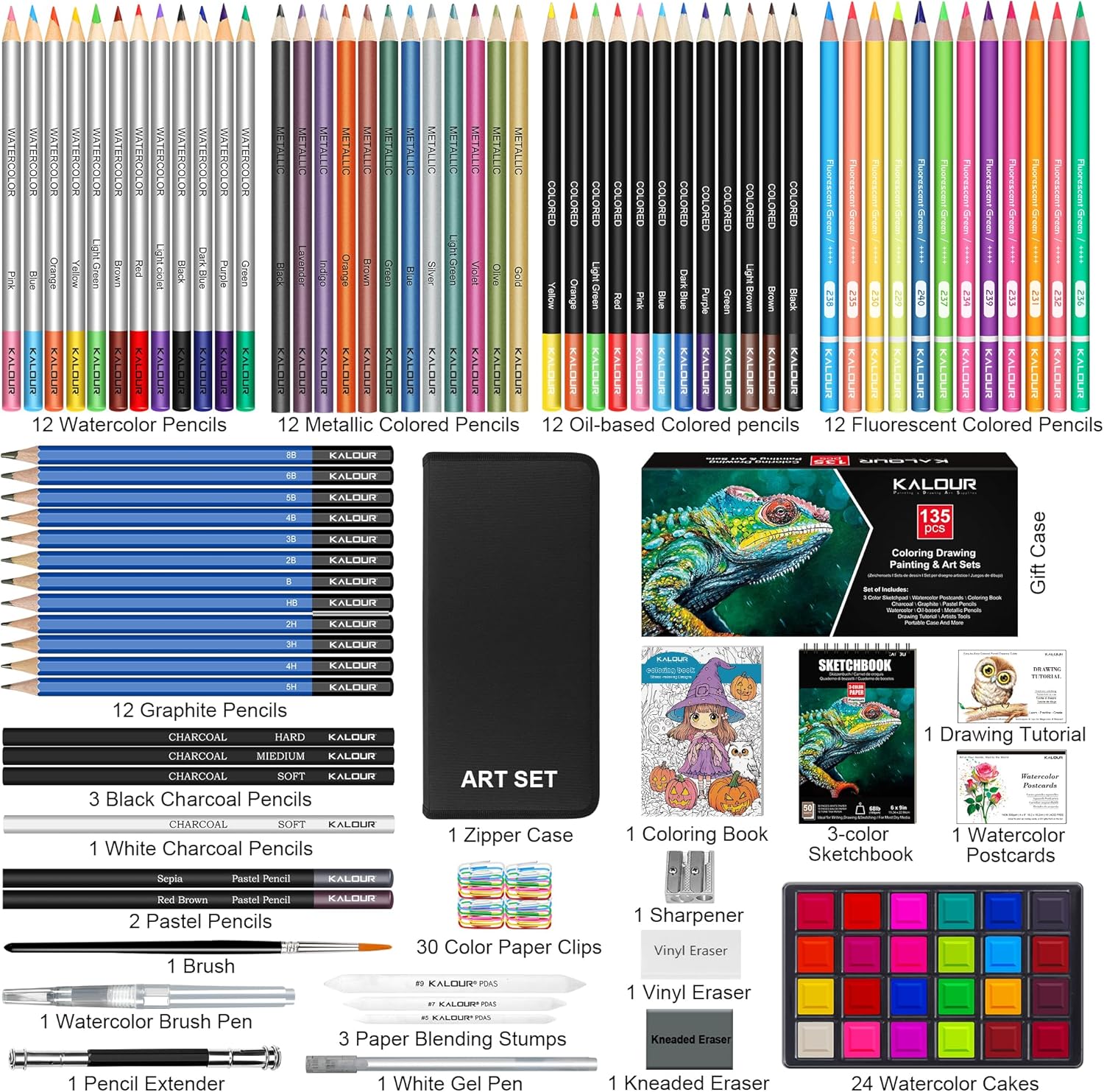 - 135PCS All-in-One Drawing Set β Complete art kit with 12 oil-based colored pencils, 12 metallic pencils, 12 watercolor pencils, 12 graphite pencils,12 Neon colored pencils, 24 watercolor cakes, charcoal & pastel pencils, blending tools, eraser, brush, watercolor brush pen, sharpener, and more. Everything an artist needs in one professional set.