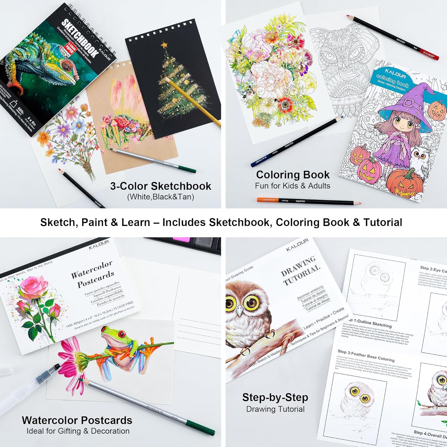 - Creative Extras Included β Comes with a 50-page 3-color sketchbook, 20-page coloring book, 15 watercolor postcards, and a step-by-step drawing tutorial. Perfect for practicing techniques, relaxing with coloring, or sharing your art as gifts.