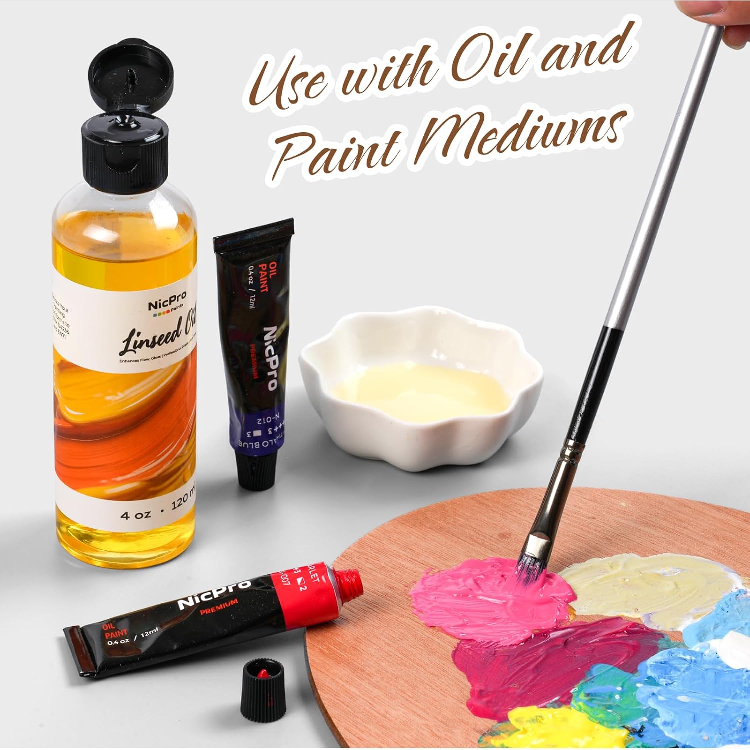 Nicpro Linseed Oil for Painting, 4oz Refined Linseed Oil Medium for Thinning Oils, Artists, Painting Thinner, Professionals to Enhance Flow, Translucency & Gloss