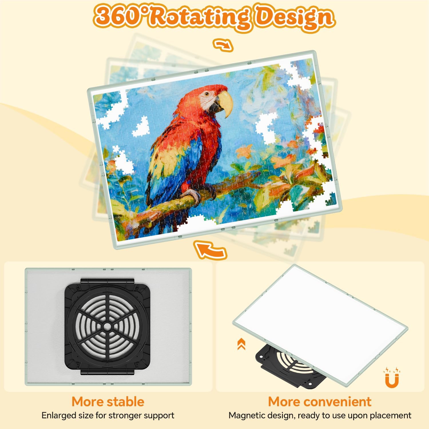 - 【360° Free Rotation】: The puzzle board is equipped with a silent bearing structure, allowing the tabletop to rotate smoothly to any angle with a gentle push. Adjust your puzzle perspective without having to stand up—perfect for group collaboration, as it prevents frequent movement from disrupting already assembled sections.