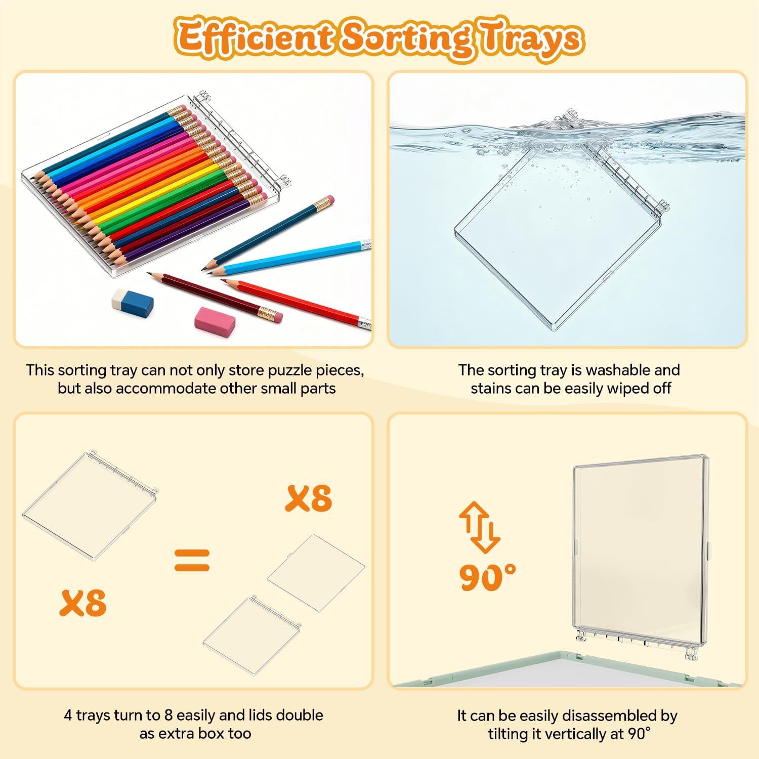 - 【4 Detachable Drawers with Protective Covers】: Our rotating puzzle board includes four easily removable and foldable drawers designed for flexible use. Each drawer is fitted with a transparent cover that keeps out dust and pet hair, protecting puzzle pieces from moisture and dirt. Each box can also be divided into two separate work trays by removing the cover, enabling multiple people to collaborate comfortably at the same time.