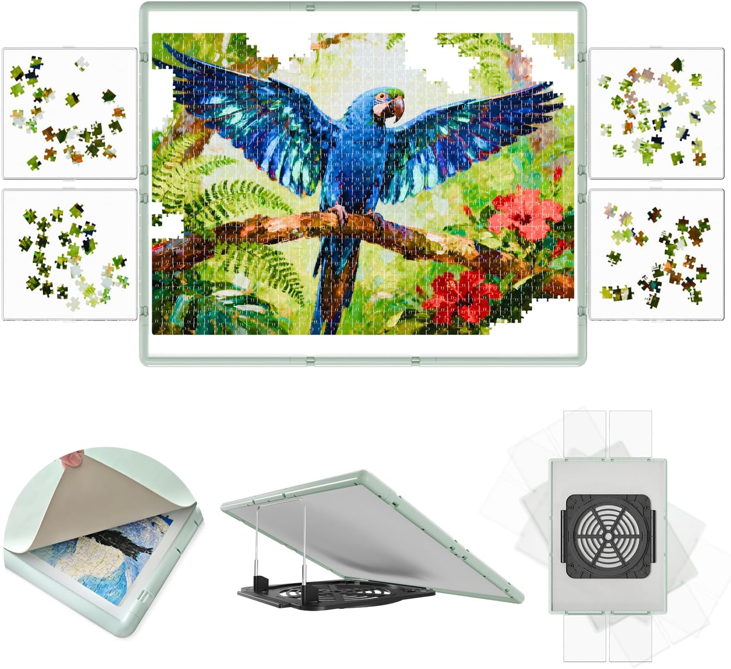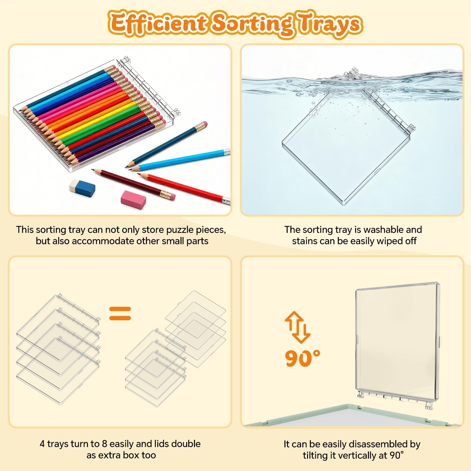 - 【4 Detachable Drawers with Protective Covers】: Our rotating puzzle board includes four easily removable and foldable drawers designed for flexible use. Each drawer is fitted with a transparent cover that keeps out dust and pet hair, protecting puzzle pieces from moisture and dirt. Each box can also be divided into two separate work trays by removing the cover, enabling multiple people to collaborate comfortably at the same time.