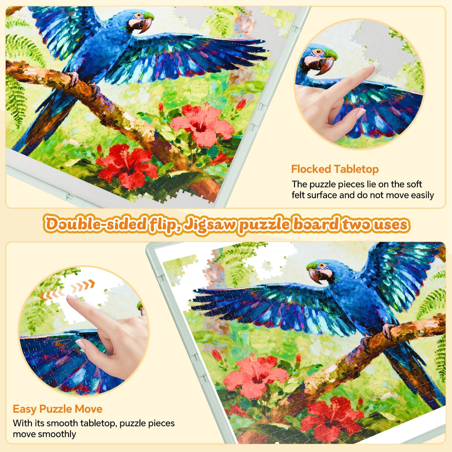 - 【Dual-Sided Usability】: One side of our jigsaw puzzle board features a soft velvet-flocked surface that prevents puzzle pieces from slipping and protects printed patterns from wear, making it ideal for long-term assembly. The other side is a smooth, waterproof panel that can be used directly as a temporary dining table or a children’s play table. This dual-sided design enhances space efficiency and versatility.