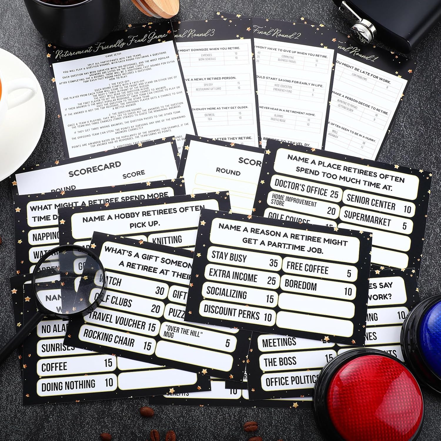 - Retirement Friendly Feud Game Set: enjoy a lively retirement trivia night with our complete set, includes 1 game instruction card, 2 score cards, 20 retirement theme question cards and 5 quick final game cards, 28 cards in total for non-stop fun