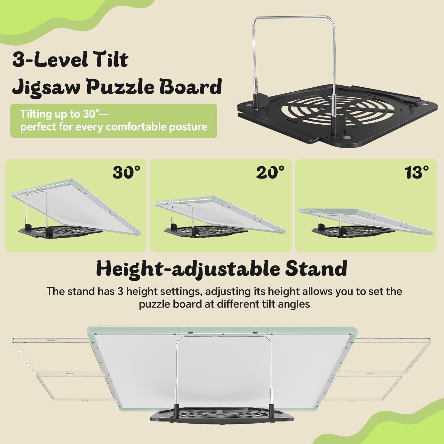 - 【3 Adjustable Tilt Angles】The jigsaw puzzle board supports tilt angle adjustment at 13°, 20°and 30°. You can flexibly adjust the tilt angle by modifying the height of the support brackets. Every puzzle enthusiast can find the optimal viewing angle and most comfortable seating position on our puzzle board. Meanwhile, the flexible angle adjustment helps alleviate discomfort such as stiff neck and sore back.