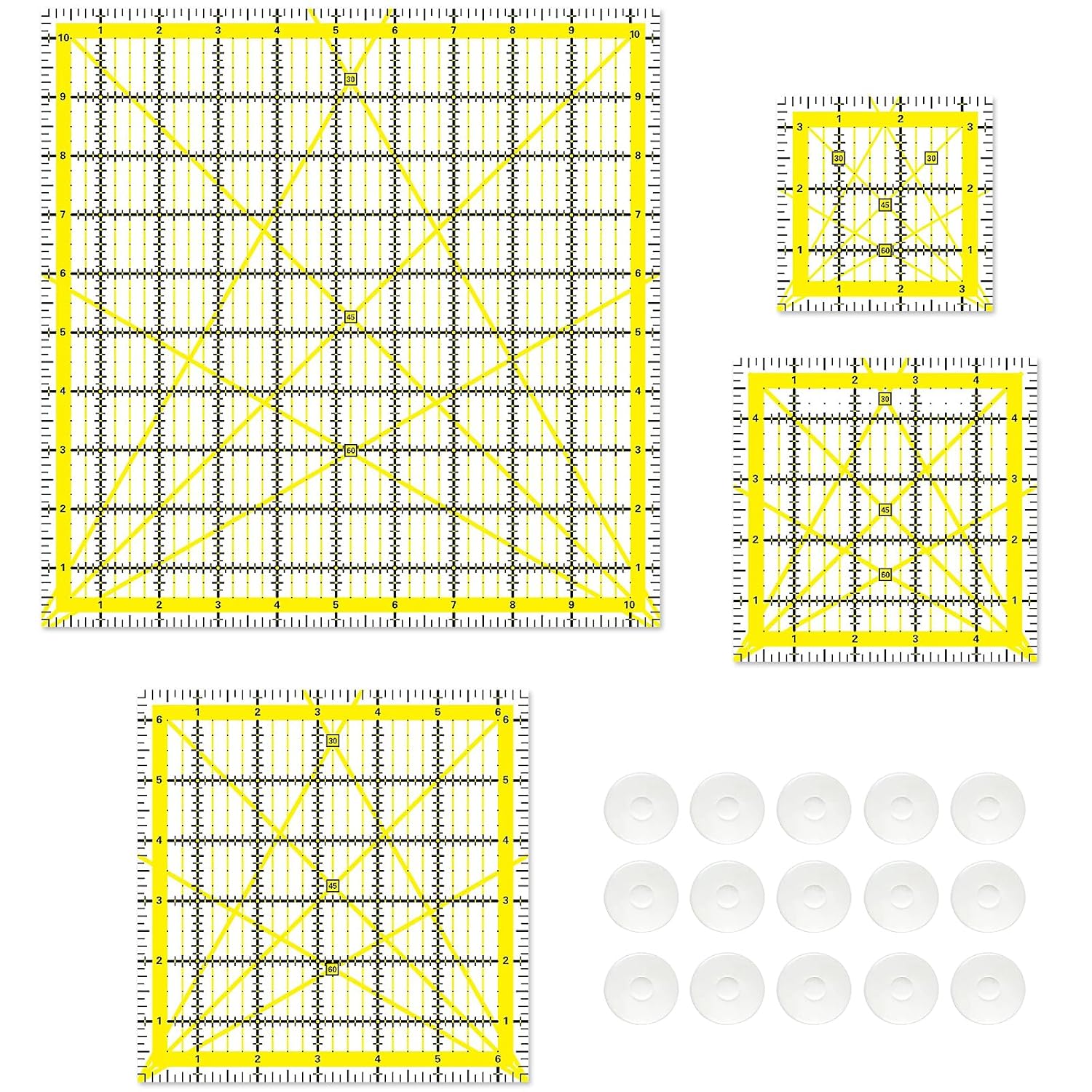 - COMPREHENSIVE SET: This Quilting rulers includes 4 quilting square rulers in different sizes (3.5” x 3.5”, 5” x 5”, 6.5” x 6.5”, 10.5”x 10.5”) to meet your different needs.