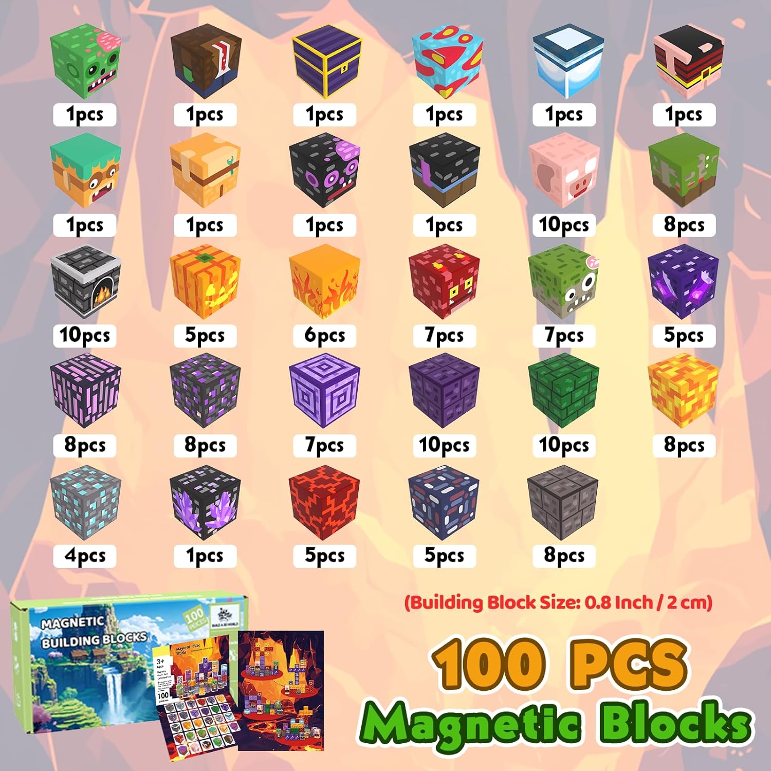 - 【Magnetic Blocks for Kids】This set includes 100pcs 0.8inch magnetic blocks in 29 distinct designs, plus a creative storybook packed with step-by-step building patterns. It’s the perfect screen-free activity to spark imagination, kids can follow the illustrated guides or design their own structures from scratch.