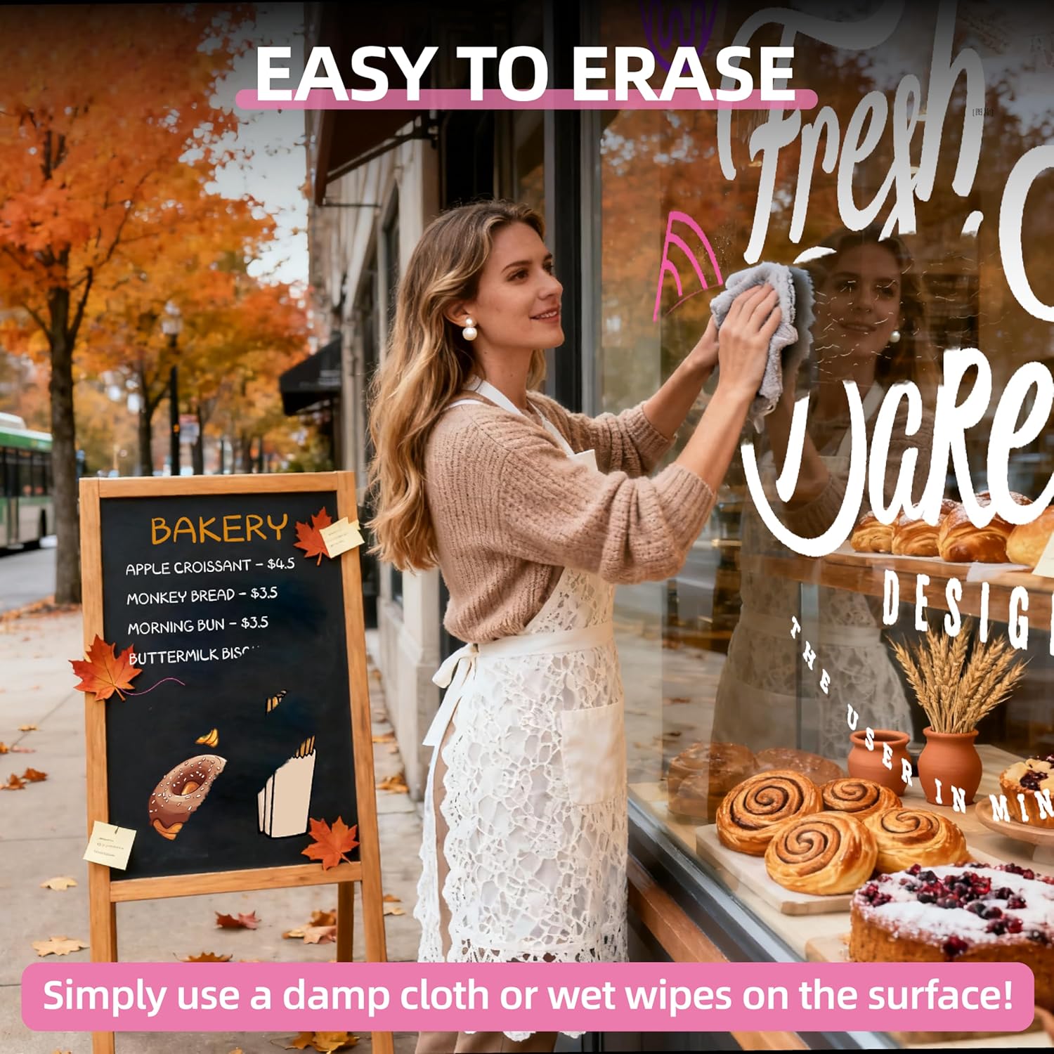 - 【Easy to Erase】These chalk markers are washable and easy to erase on non-porous surfaces such as glass, mirrors, and whiteboards (Easy erasable). On porous surfaces like wood, the ink is permanent, making them ideal for long-lasting designs. Dust-free and mess-free, simply draw with the markers and wipe them away when you're done