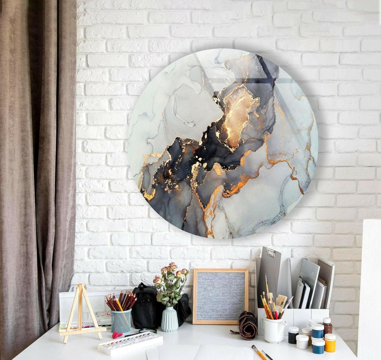 My Photostation.com 20''(50cm) Diameter Gold Details Gray Marble Round Glass Wall Art Tempered Glass Printing Wall Decor Large Wall Art Wall Hangings