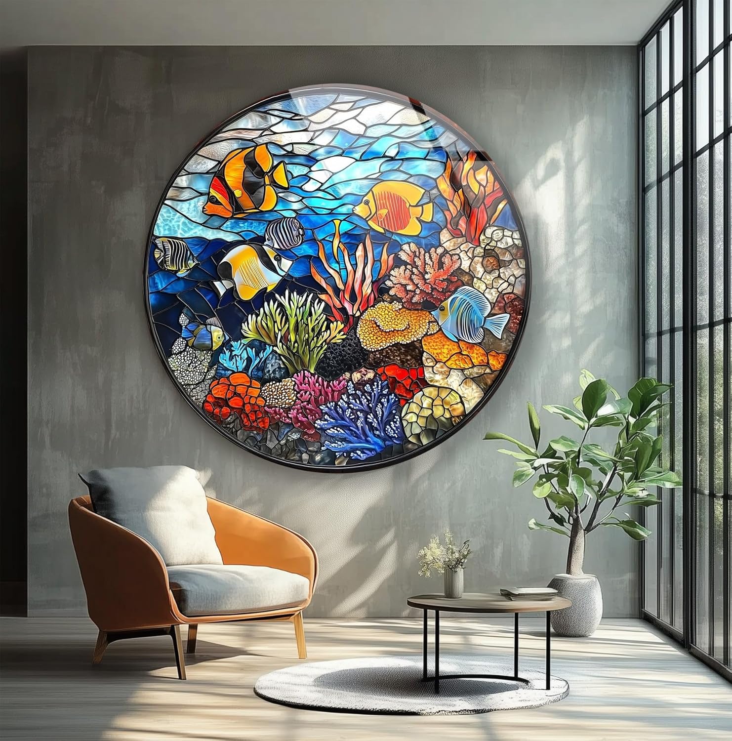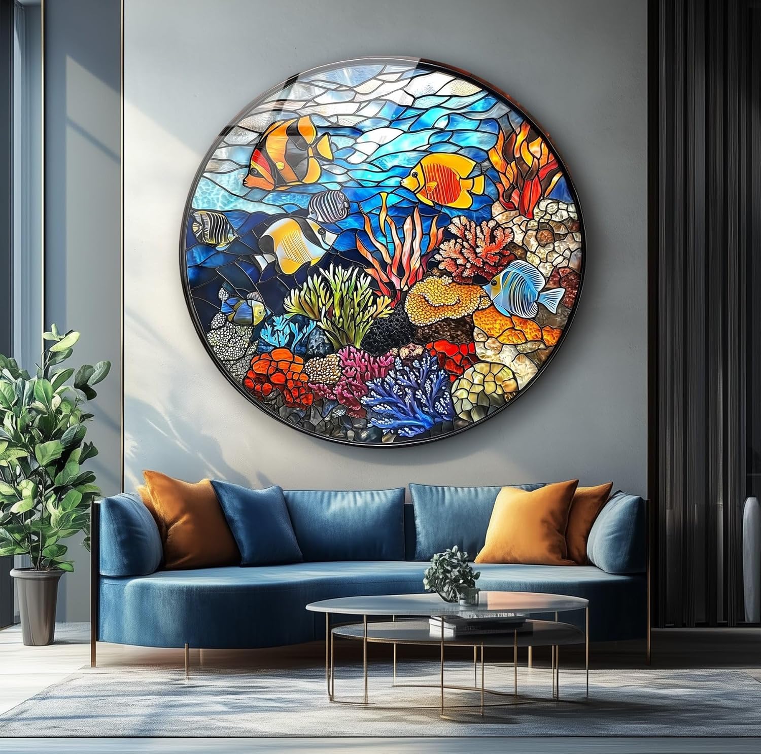 My Photostation.com 39,4''(100cm) Diameter Coral Reef Mosaic Round Glass Wall Art Tempered Glass Printing Wall Decor Large Wall Art Wall Hangings
