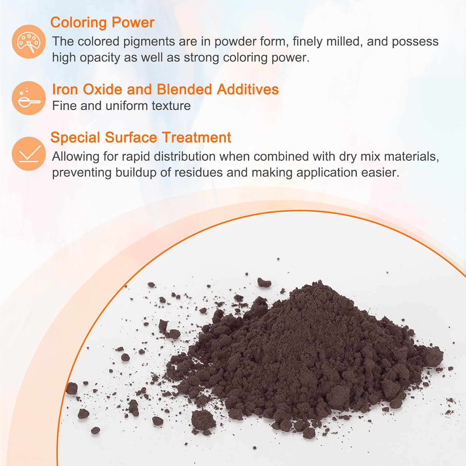 - Feature - Iron oxide pigment powder exhibits a matte and opaque finish, creating warm earth tones. All concrete pigment are suitable for both indoor and outdoor use, and they can be mixed to achieve a variety of shades. The vibrant colors add a unique and eye-catching touch to your projects, enhancing the appearance of concrete and cement by adding color and depth.