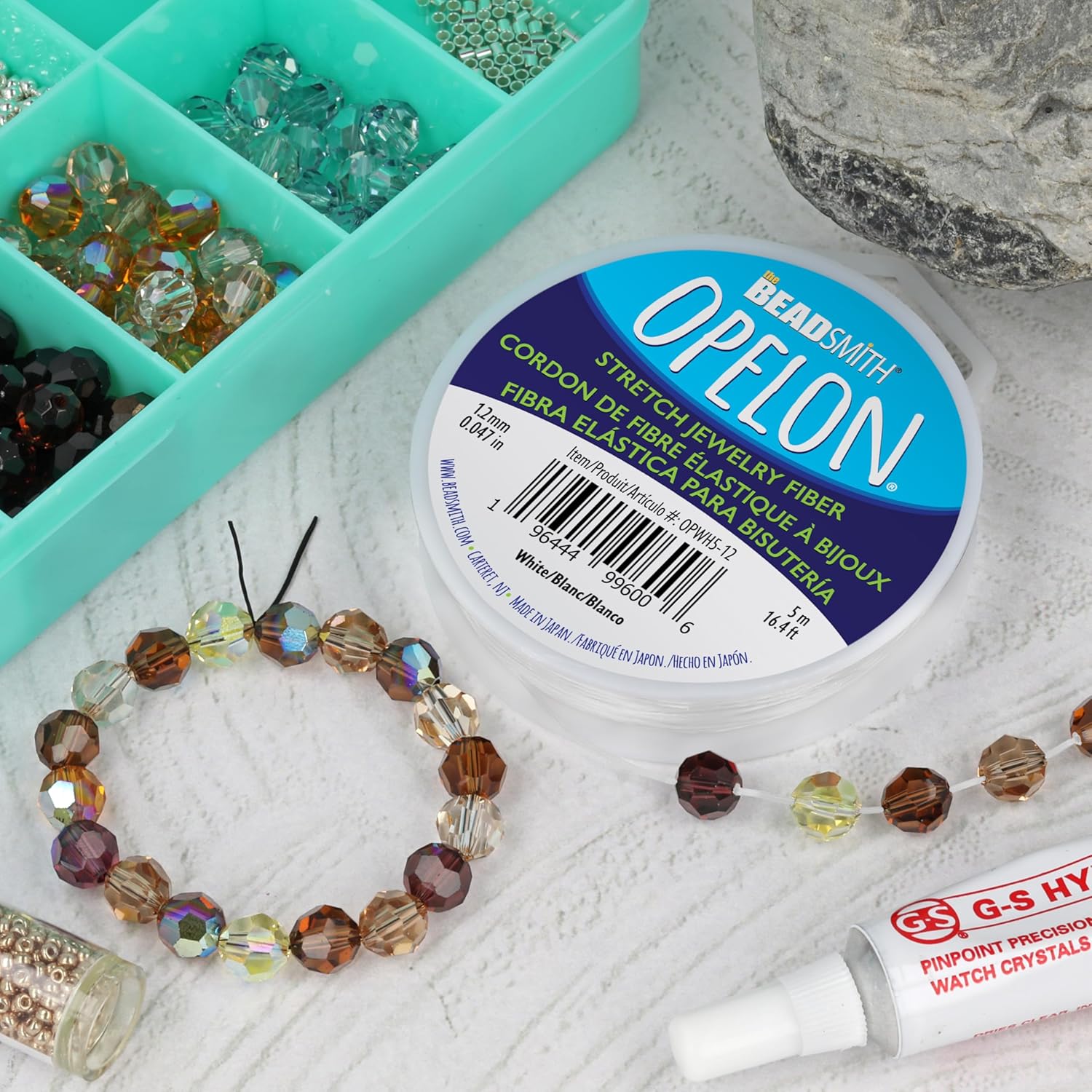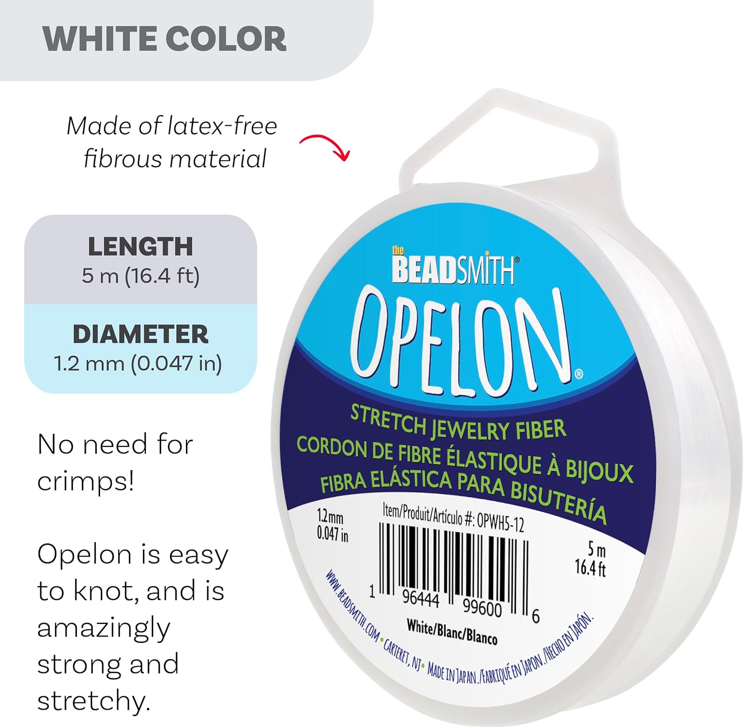 - OPELON FIBER: This stretchy jewelry string is made of a white fibrous material and measures 1.2 mm in diameter. The 5 meters are wound on a spool that is secured with a clear plastic clip to keep your cord secure and organized.