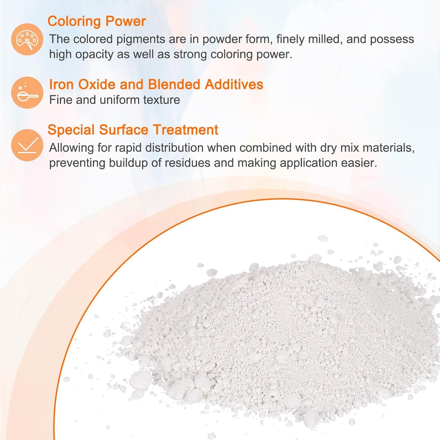 - Material - The concrete pigment is composed of iron oxide and blended additives, proportioned to achieve a fine and uniform texture. It features rich and soft colors, providing concrete products with a naturally durable mineral tone. The powder particles undergo special surface treatment, allowing for rapid distribution when combined with dry mix materials, preventing buildup of residues and making application easier.