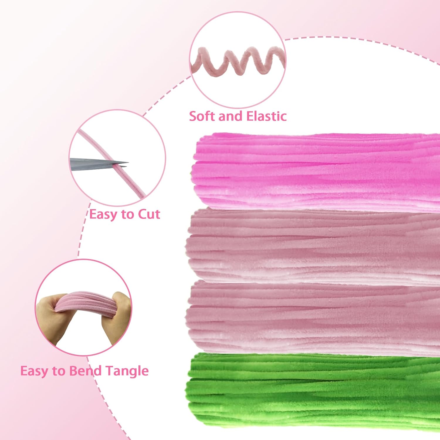 LOLEDE 400Pcs Pipe Cleaners Craft Kit, 3 Colors Chenille Stems for DIY Artificial Flower Making with Floral Wires, Gardening Tape, LED String Lights, Pearl Beads & Ribbon (Pink)