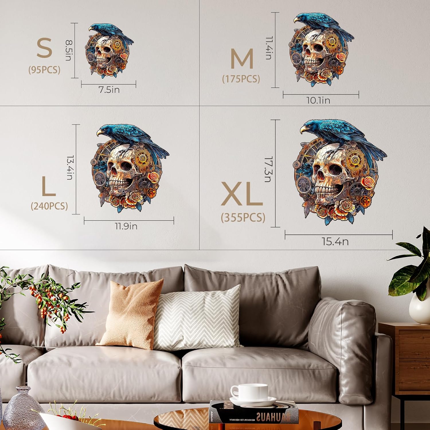 KAAYEE Wooden Puzzles for Adults, Raven & Mechanical Skull Wooden Jigsaw Puzzle 355 PCS Unique Shape Wood Puzzles Adult, 3D Visual Effect Flat Puzzle Birthday Gifts Family Games (XL-17.3 * 15.4in)