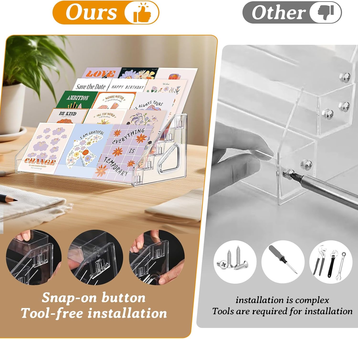 - Multi-Functional: This 5-tier acrylic card display offers convenient showcasing for your greeting cards, trading cards, graded cards, stickers, postcards, sports cards. The crystal-clear acrylic stand also doubles as an elegant organizer for cosmetics and jewelry display.