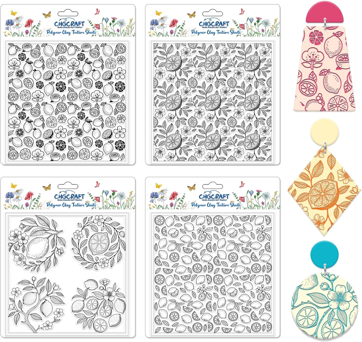 CHGCRAFT 4 Sheets 4 Styles Vintage Lemons Polymer Clay Texture Sheets Lemon Slices Silicone Texture Stamp Flowers Modeling Pattern Pad Texture Sheets for Making Earrings Jewerly, 5.5x5.5 inch