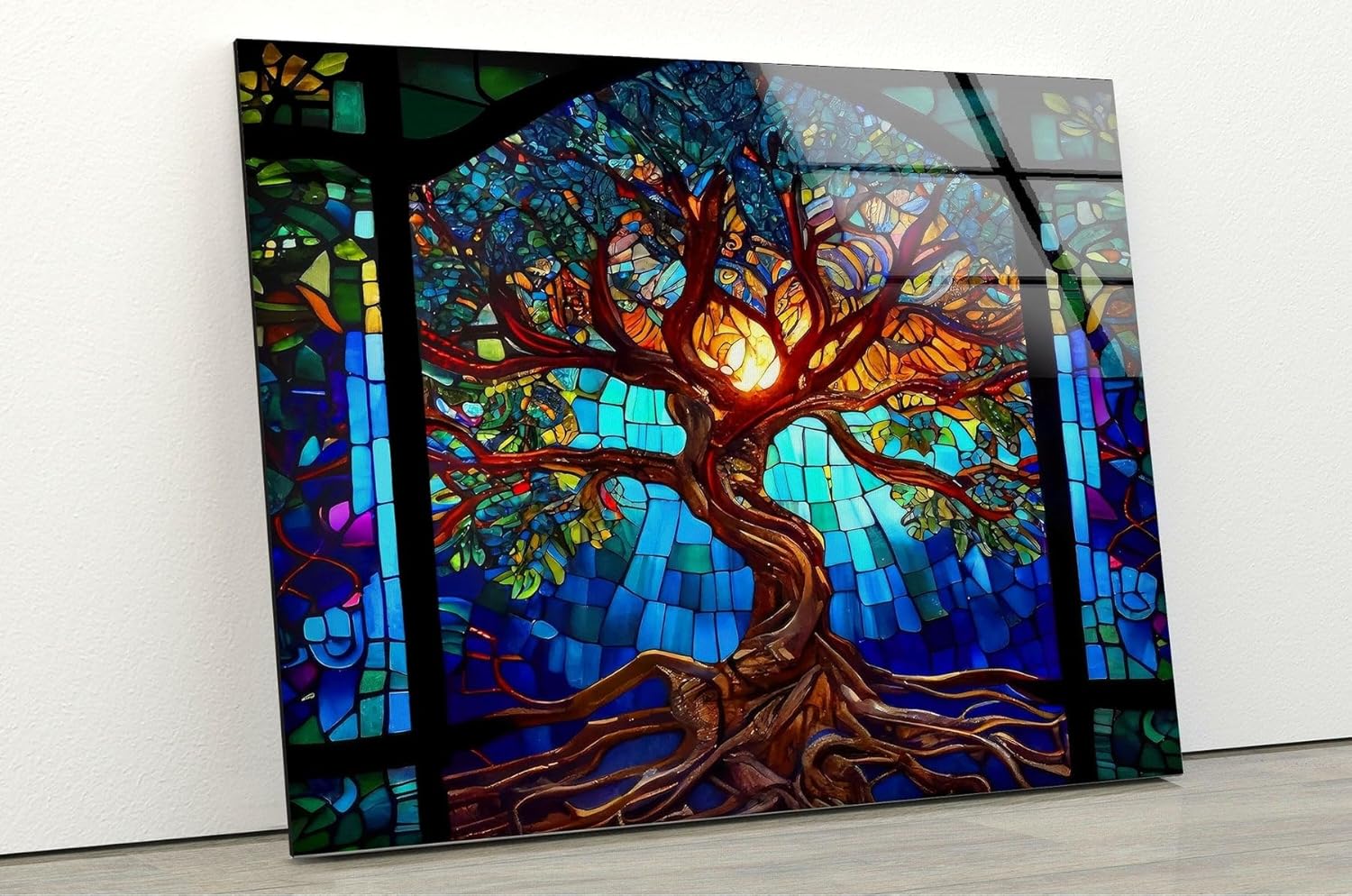 My Photostation.com 60WX40H'' Stained Blue Life of Tree Glass Wall ArtTempered Glass Printing Wall Decor Large Wall Art Wall Hangings