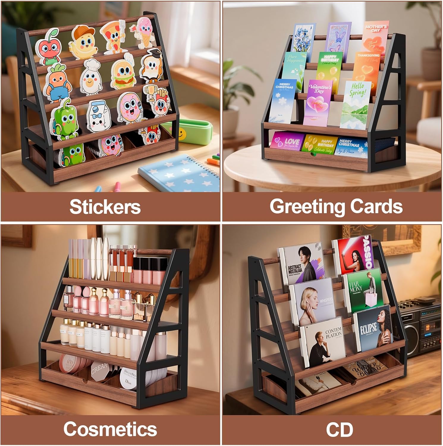 handrong Card Display Stand,3-Tier Trading Card Display with Drawer,Wooden Graded Baseball Sports Cards Holder,Greeting Cards Stand for Collection,Vendor & Show (Brown)