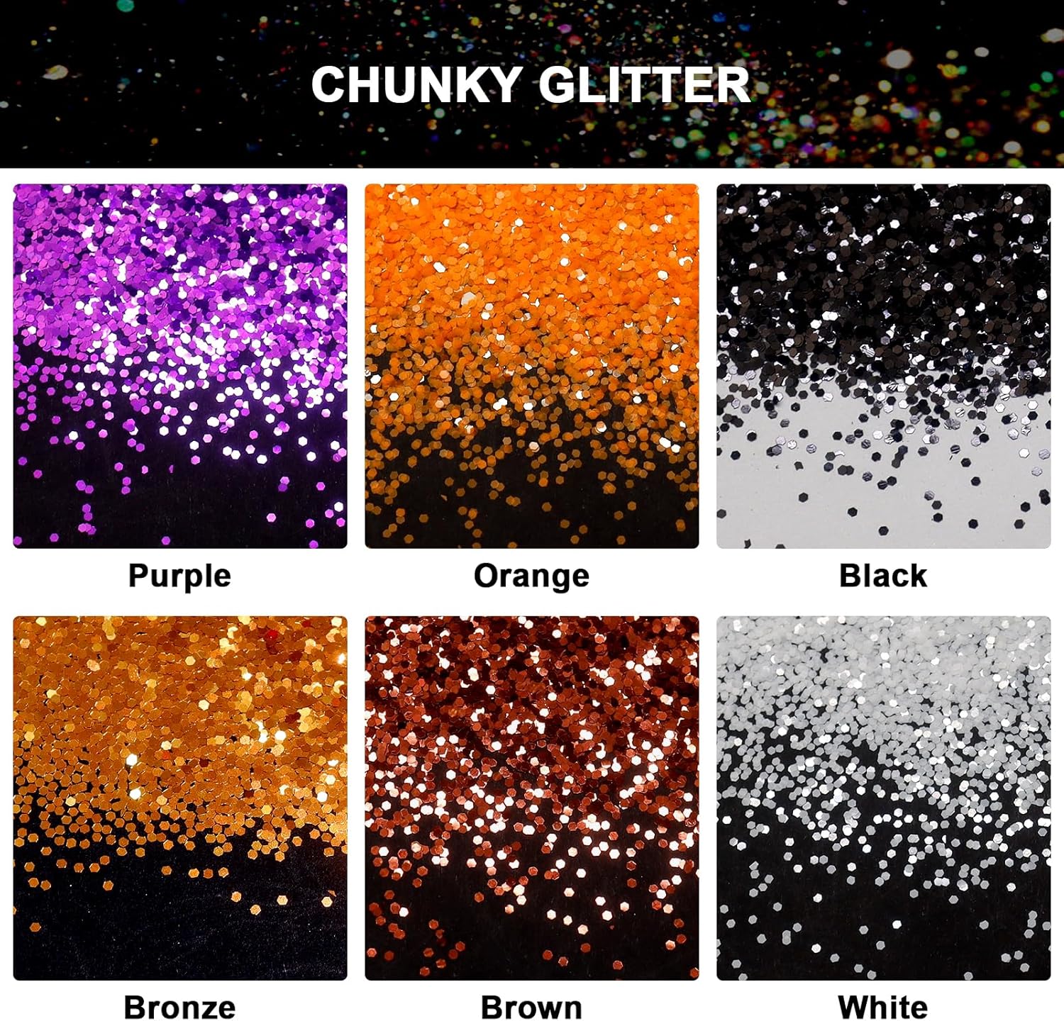 Ceya Bulk Chunky Glitter 6 Colors,4.23OZ Fall Crafts Helloween Glitter,1/24”for Pumpkin,Snowglobe Tumbler,Nail,School Classroom Art,DIY Craft Slime Poster Card,Orange,Purple,Black,White,Bronze,Brown