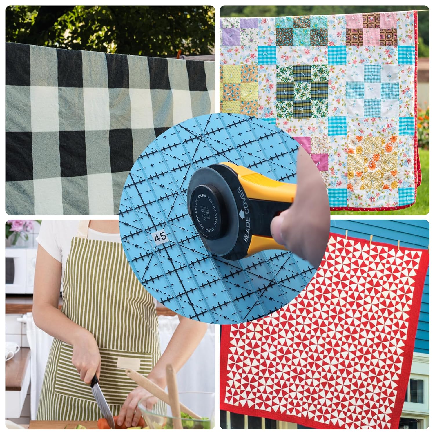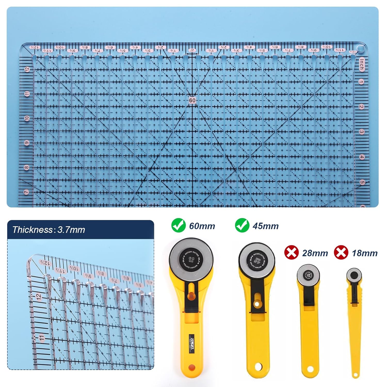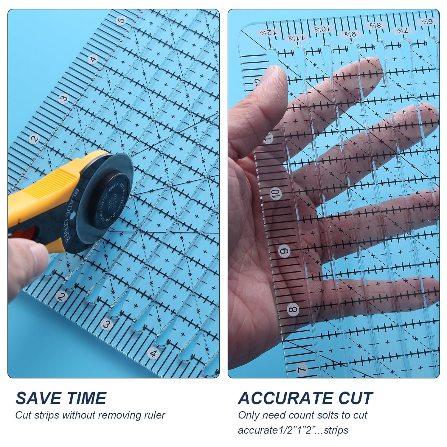 - 2.Save time for Quilting:Square up blocks up to 12 ½ inches;The slotted design allows you to effortlessly align and guide your rotary cutter, ensuring clean and straight cuts every time,cutting several strips in one minute.The sewing rulers and guides for fabric can save time for cuting.
