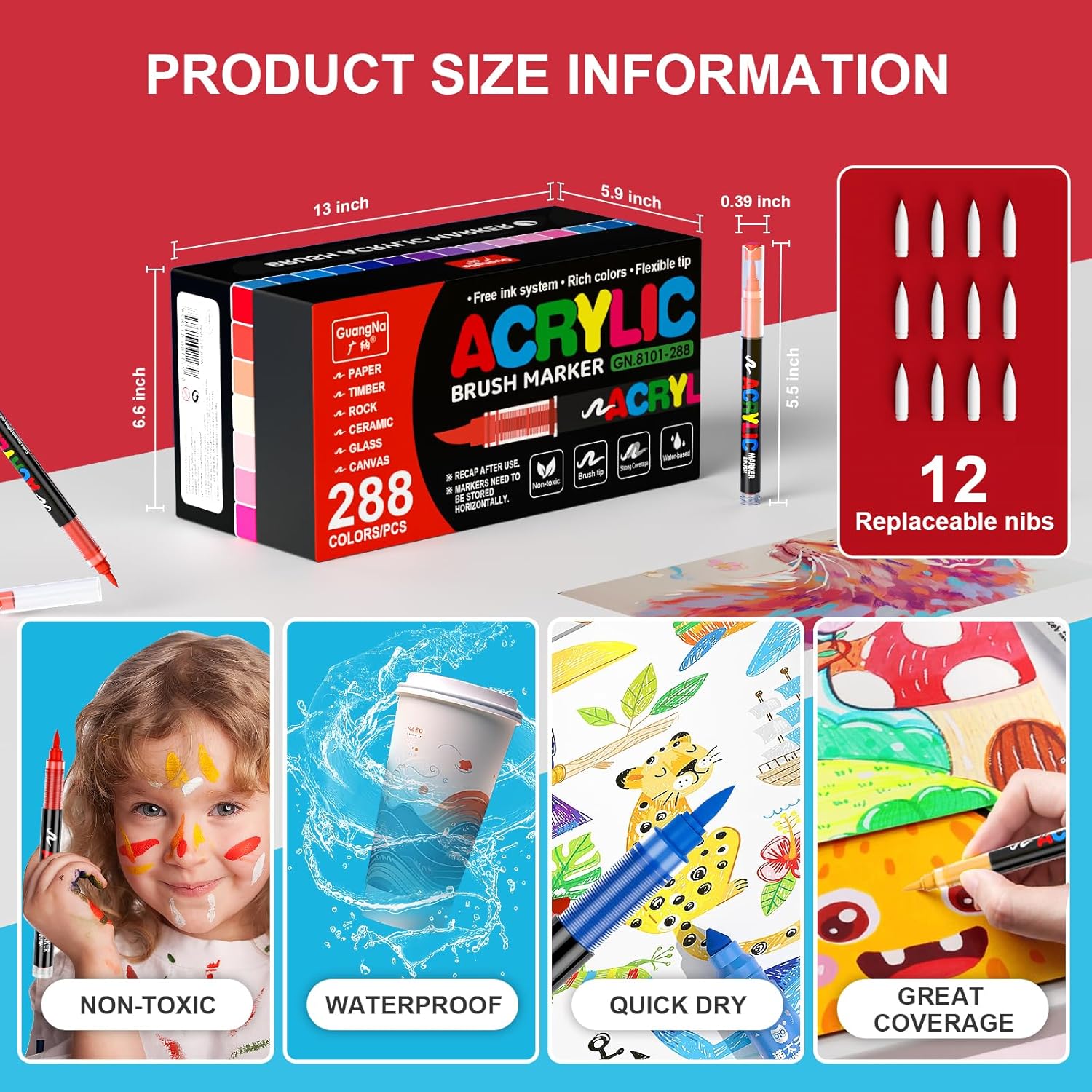 288 Colors Acrylic Paint Markers Soft Brush Tip, Water-Based Paint Pens with Automatic Ink Control System, Odorless, Waterproof, Quick-Dry, Lightfast, for Rock Painting, Canvas, Wood, Egg & DIY Crafts