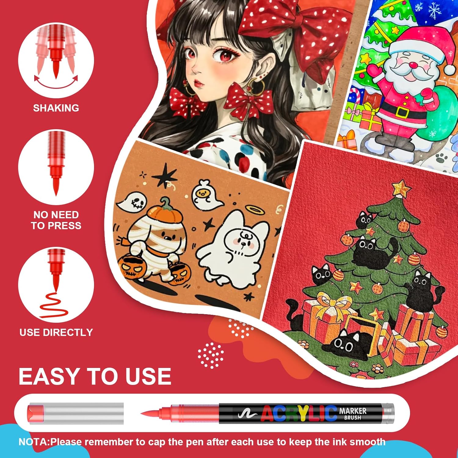 - 🌈Smooth Writing, Waterproof & Quick-Drying: This acrylic pens feature an advanced ink control system that ensures smooth, even flow and prevents nib clogging for seamless writing and drawing. The soft brush tip allows precise control, making detail work easier. The waterproof design protects your creations from water damage, while the quick-drying ink reduces wait times, boosting efficiency in your creative process.