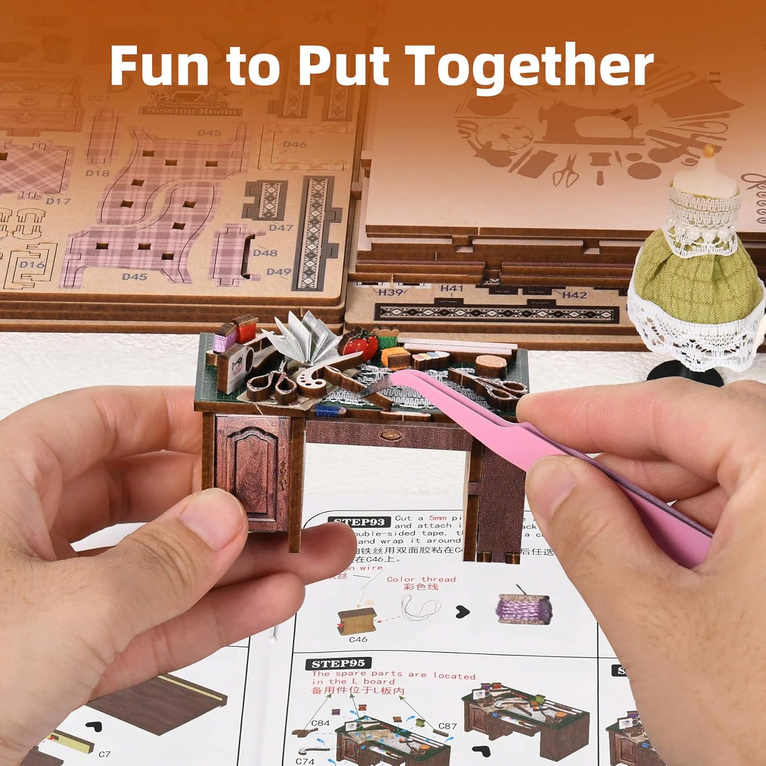Book Nook Kit, DIY Miniature House Dollhouse Kit for Adults and Teens, 3D Wooden Puzzle Bookend Creative Bookshelf Insert Decor with LED Light, Gifts for Family, Friends (Sewing Room)