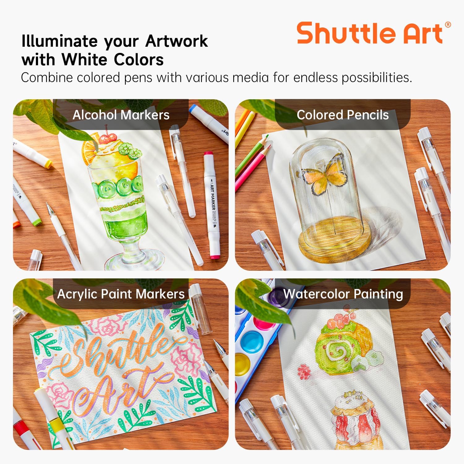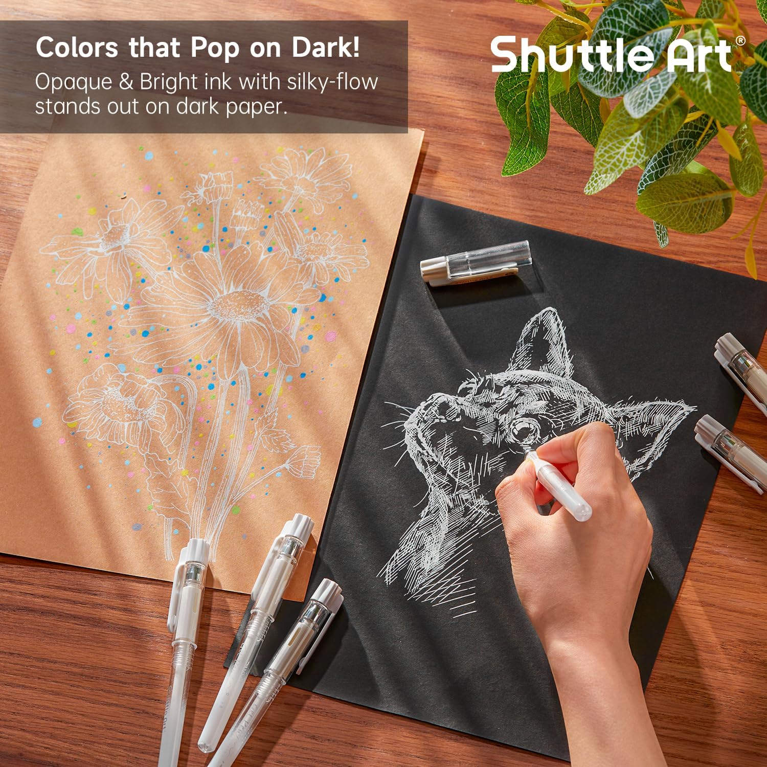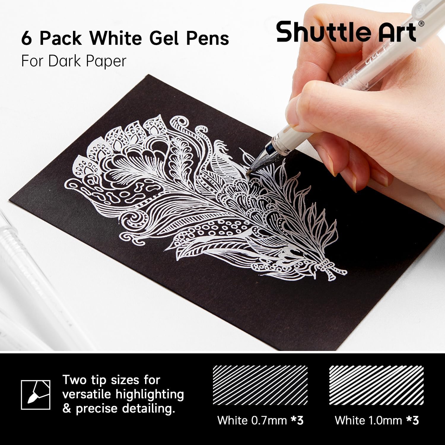 - 6 WHITE GEL PENS: Shuttle Art colored pen set includes 6 white pens: three with 0.7mm medium tips and three with 1.0mm bold tips. Vibrant and opaque colors look stunning on colored paper, especially standing out on black paper. Perfect for accents and highlights.