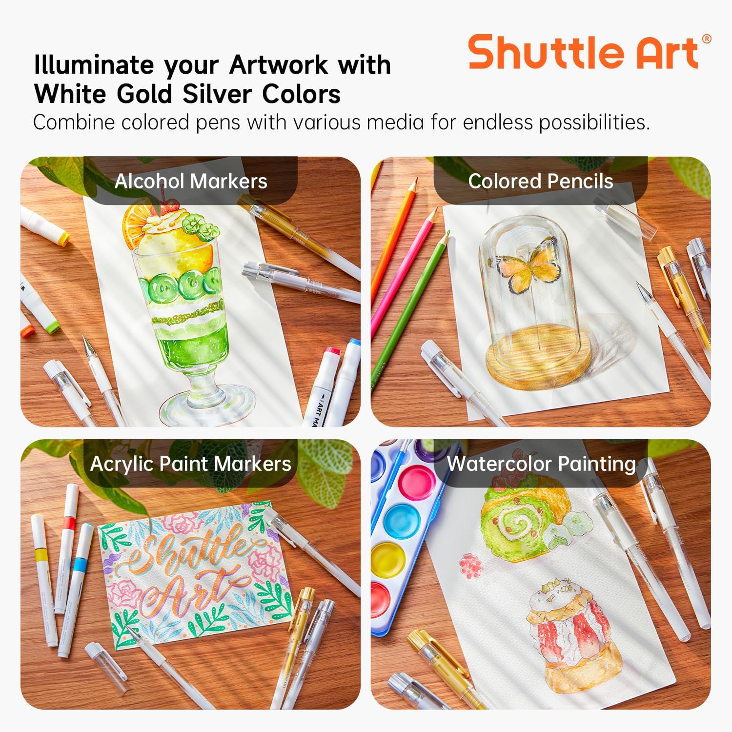 - 6 WHITE GOLD SILVER GEL PENS: Shuttle Art 6 pack colored pen set comes with 2 white (0.7mm), 2 white (1.0mm), 1 gold (1.0mm), 1 silver (1.0mm). Vibrant and opaque colors look stunning on paper, especially standing out on black paper. Perfect for accents and highlights.