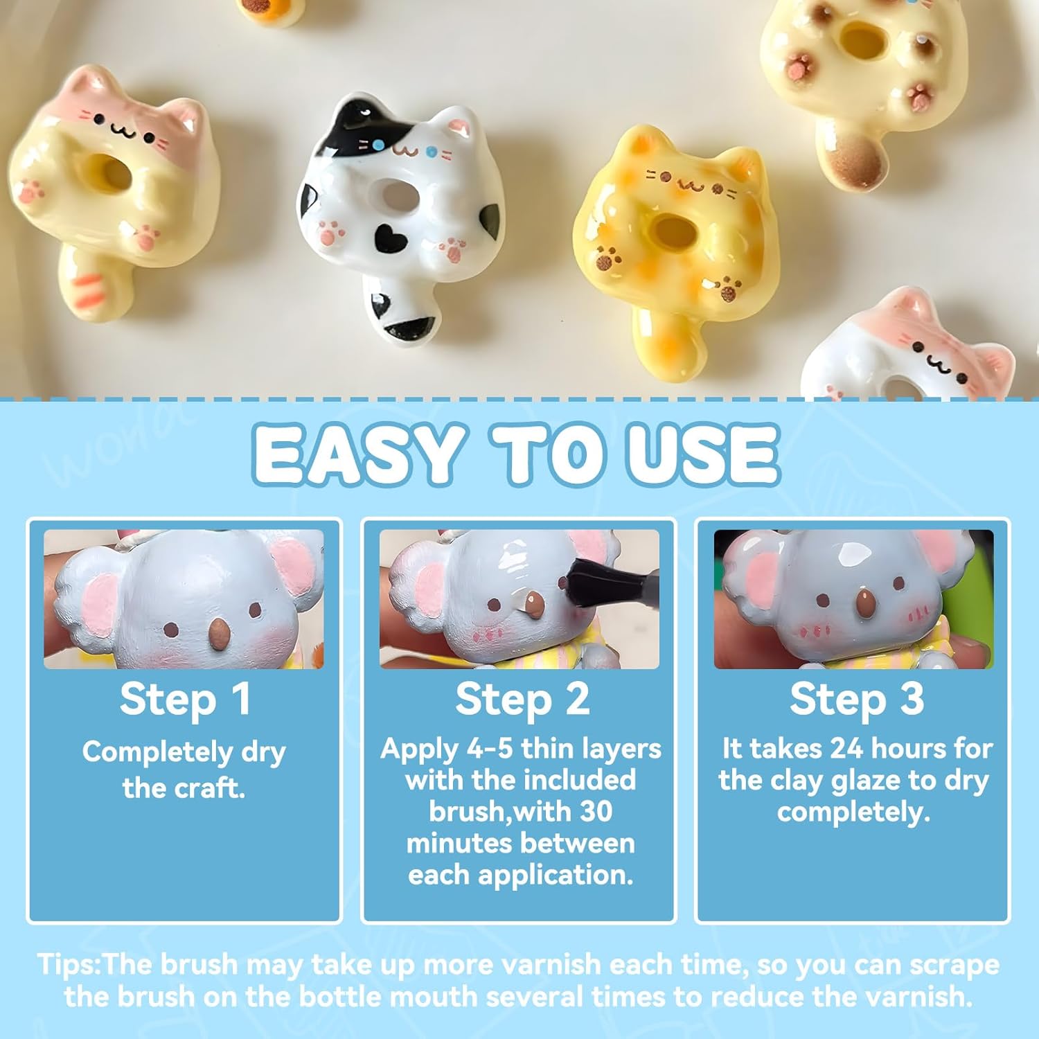 - Easy to use:After the clay color is dried, apply 4-5 thin layers with the included brush.You can wait 30 minutes for each application before applying the next application.The polymer clay glaze has completely dried for 24 hours.