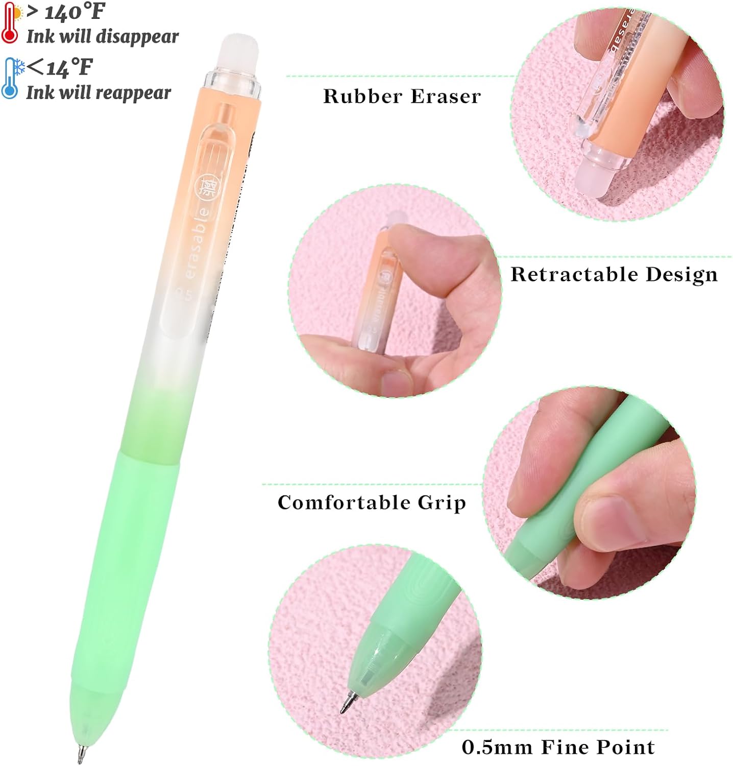 - Smooth Writing High Quality Ink: This 0.5mm fine point erasable ink pen uses high-quality ink, ensuring smooth writing without jamming or bleeding. The eraser on top make mistakes disappear easily