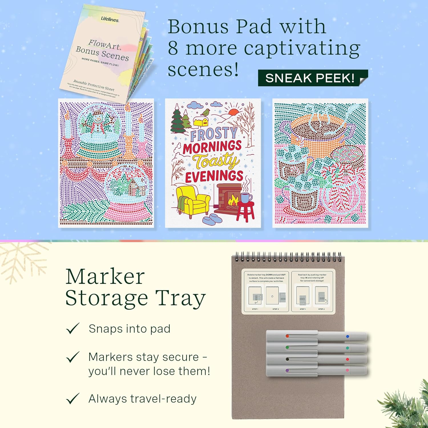 Lifelines FlowArt Activity Pad, 2-Pack Winter Set + Bonus Pad - Guided Art Meditations with Markers – Dot-by-Letter & Illuminate & Create - Coloring Books for Tweens, Adults & Seniors