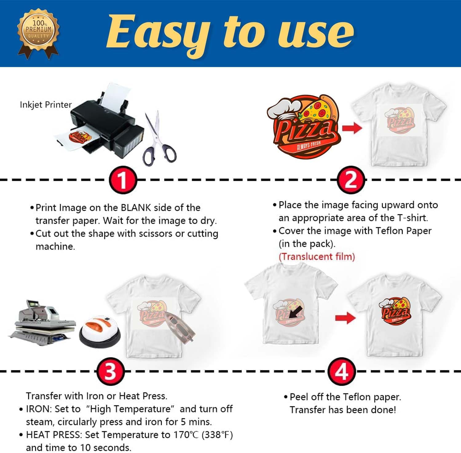 - 💕EASY TO USE: [1] No mirror print & cut out your design. [2] Place the printed image facing upwards onto fabrics and cover the image with Teflon sheet (in the pack). [3] Transfer image with iron or heat press. [4] Remove the Teflon paper. Transfer has been done! Step-by-step instructions are on the back of cover paper in the pack. Video tutorial is in videos section of this page for your reference.
