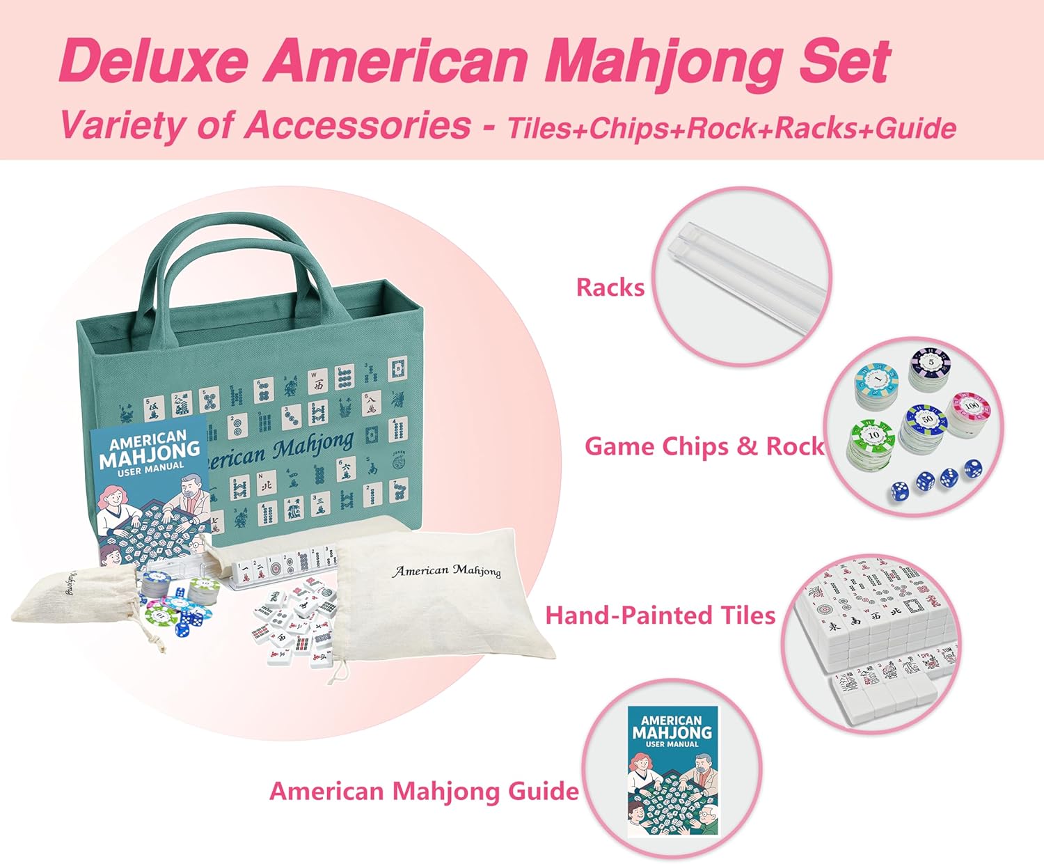 - 🧳 【Smart Storage System – 1 Bag + 3 Pouches】 Keep your Mahjong Tile Set organized at all times. The stylish green canvas bag holds everything, while 3 custom linen pouches separately store tiles, racks, and chips. With this thoughtful design, packing and unpacking your American Mahjong Tile Set is fast, neat, and hassle-free.