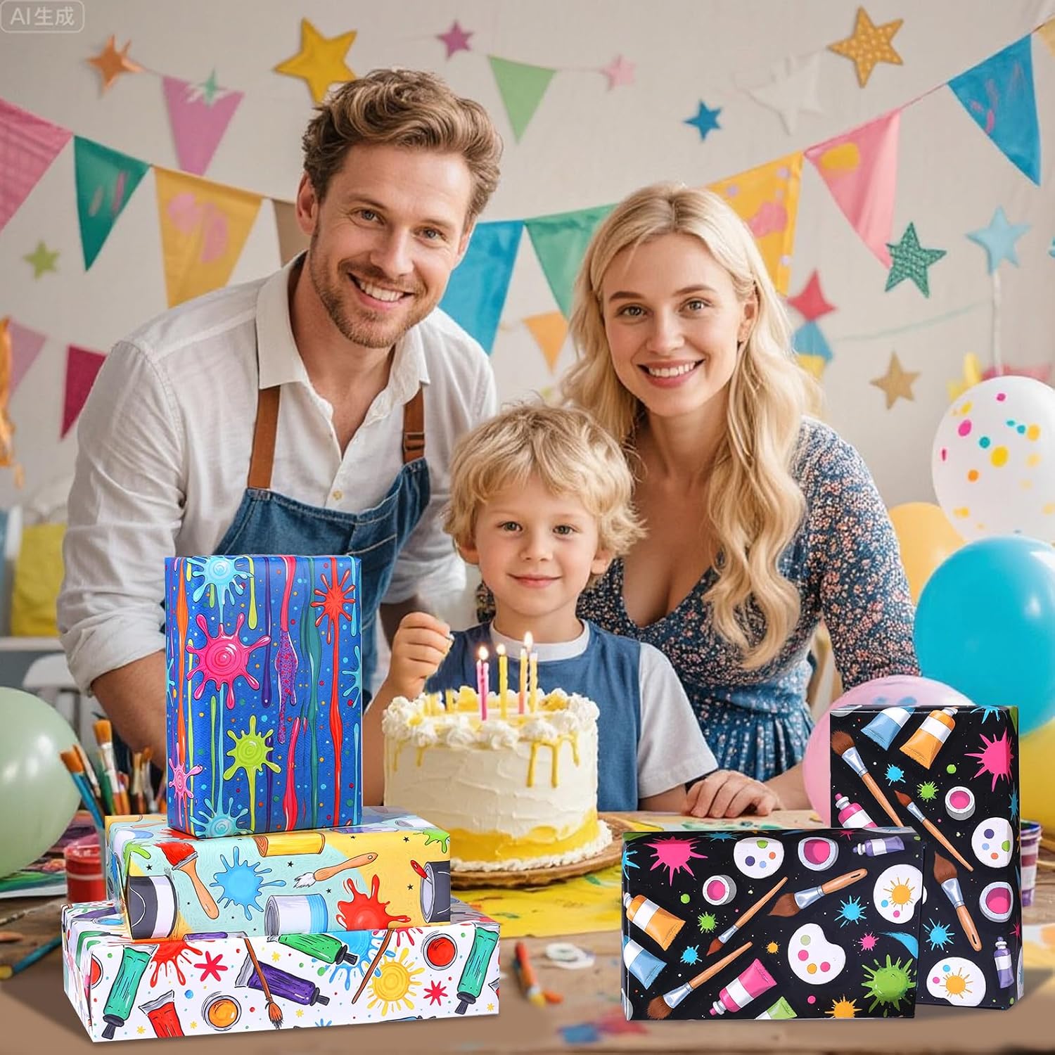 - Vibrant Artistic Designs: This set includes 12 sheets of high-quality painting wrapping paper, featuring 4 unique designs (3 sheets each) showcasing colorful paint tubes, brushes, palettes, and whimsical art doodles. Perfect for any art lover's gift!