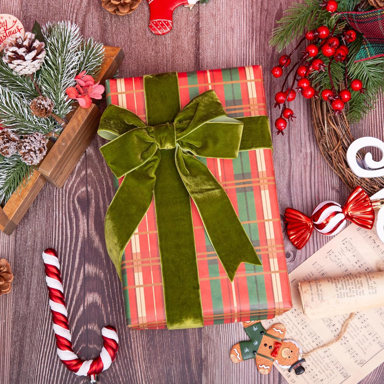 Vintage Moss Green Velvet Ribbon Christmas Ribbon for Gift Wrapping Crafts Christmas Tree Ornaments Garland Decorations, 1-1/2 Inch X 25Yd
