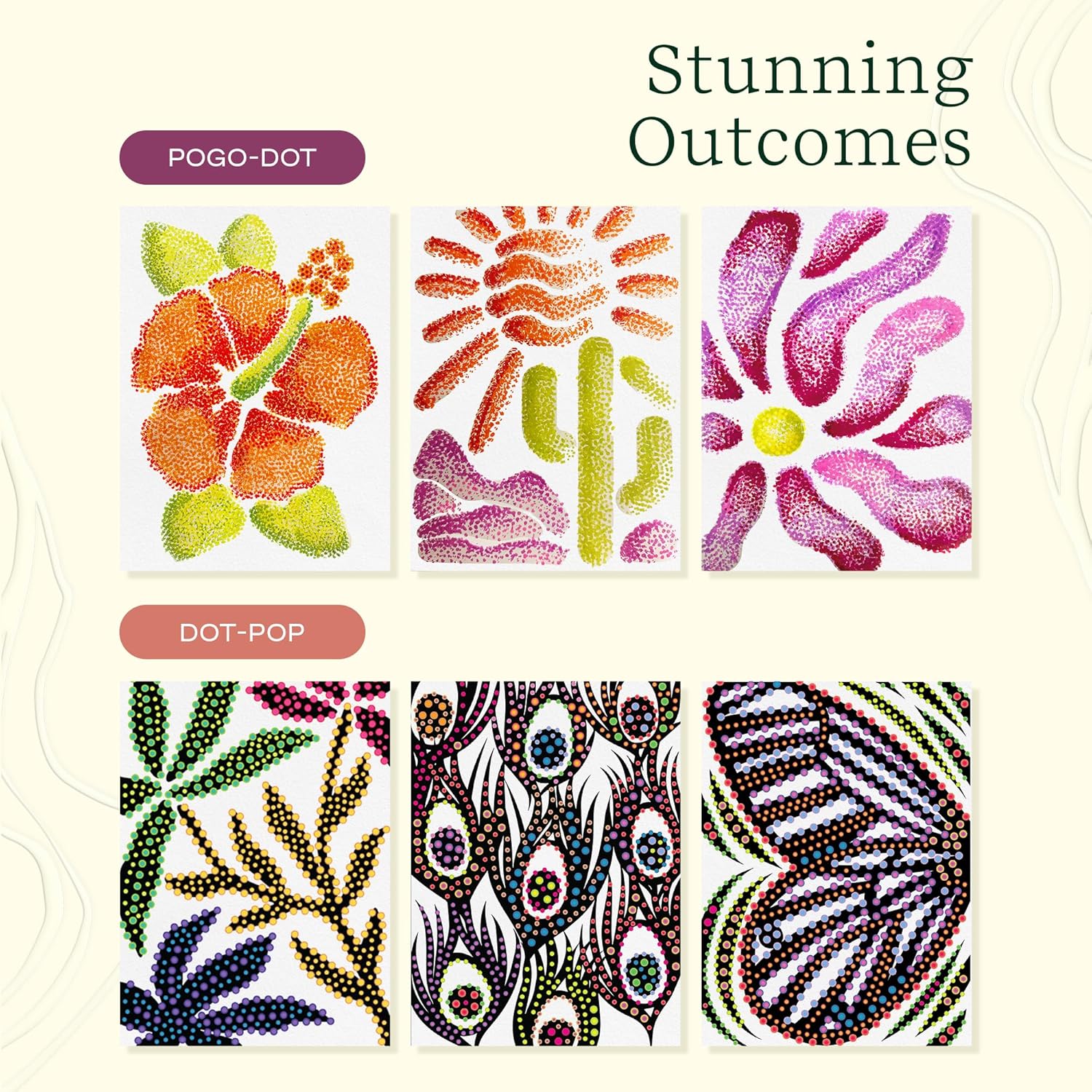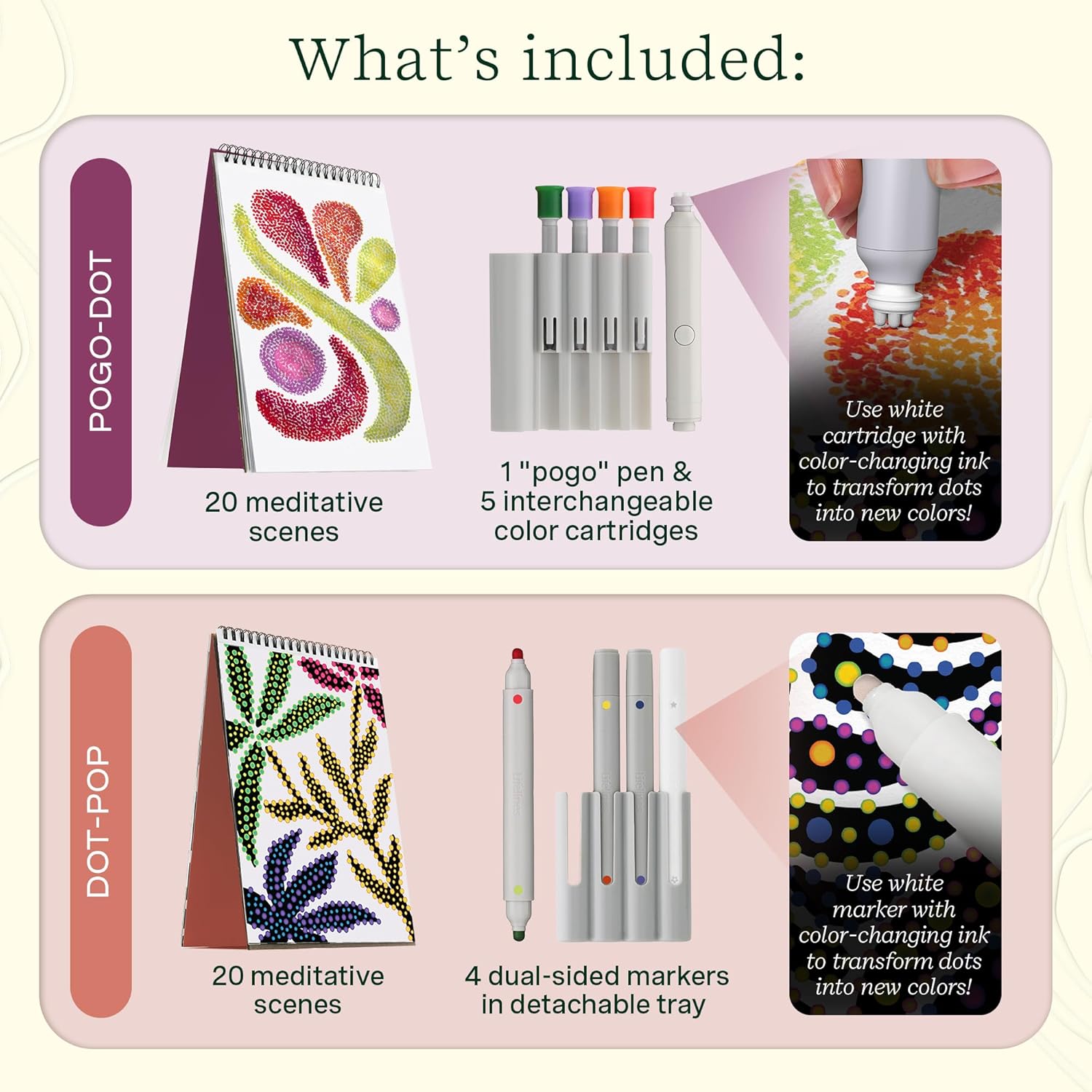 - Dot-Pop, Natural Flow: Use the special dot markers to fill in the empty spaces with dots to create an amazingly colorful scene. Then, use the white marker with color-changing ink to transform dots into new colors!