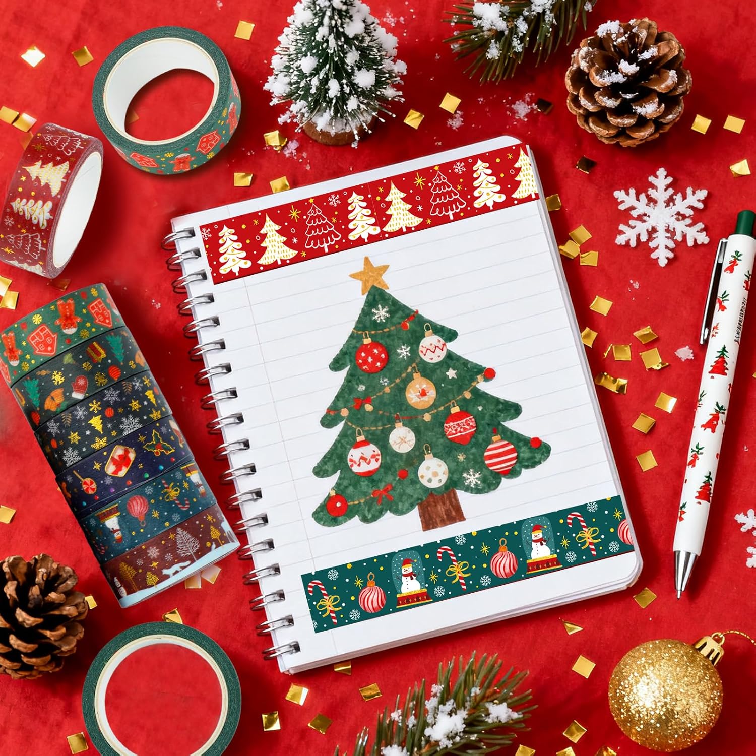 12 Rolls Christmas Washi Tapes Christmas Tree Snowman Snowflakes Gingerbread Man Masking Tape Red Green Gold Foil Xmas Decorative Tape for Xmas Scrapbook Journal Gift Wrapping DIY Crafts 16.4FT