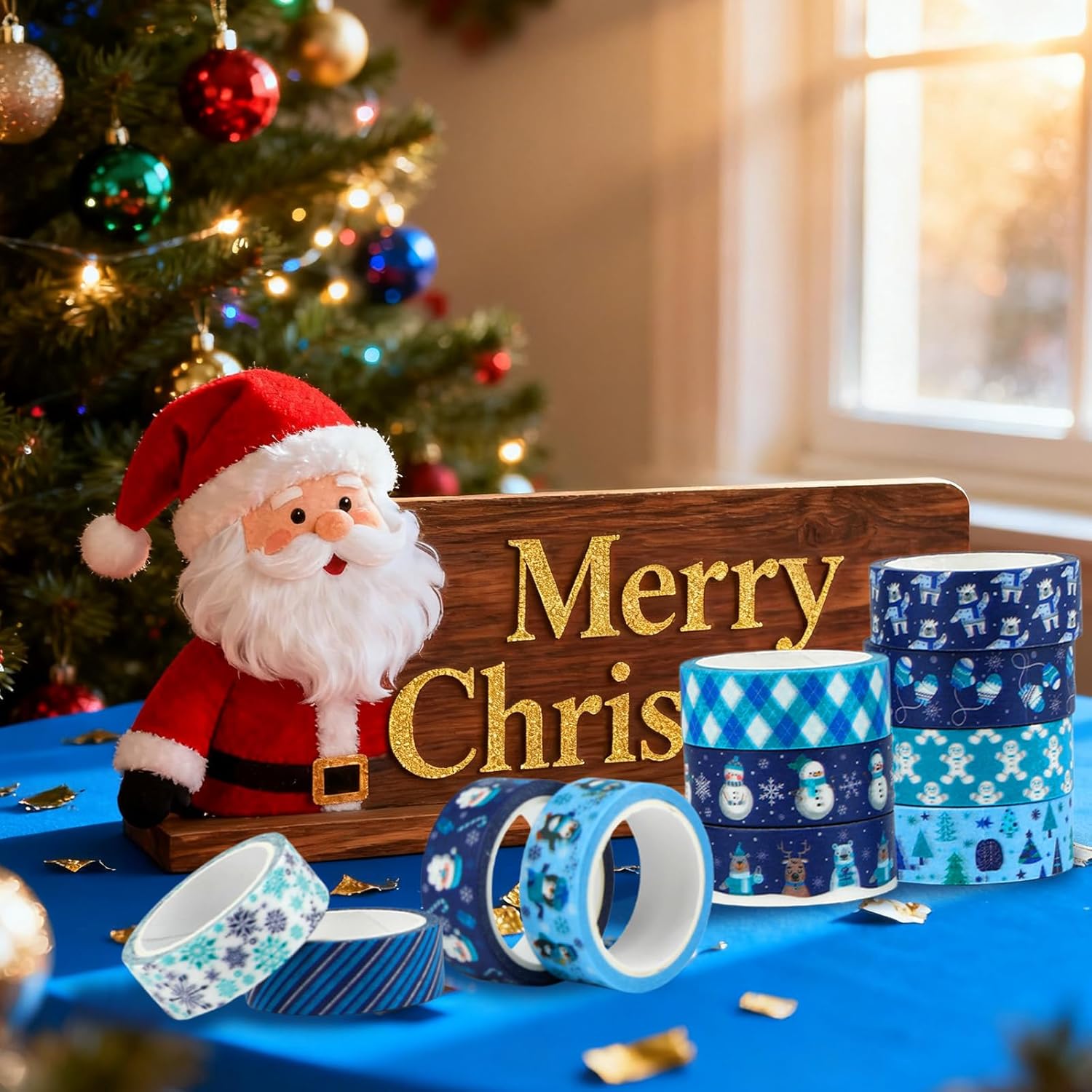 12 Rolls Winter Washi Tape Set Blue White Snowflake Snowman Holiday Masking Tape Xmas Tree Reindeer Penguin Holiday Decorative Tapes for Scrapbook Journal DIY Craft Gift Wrapping Party Decor 16.4FT
