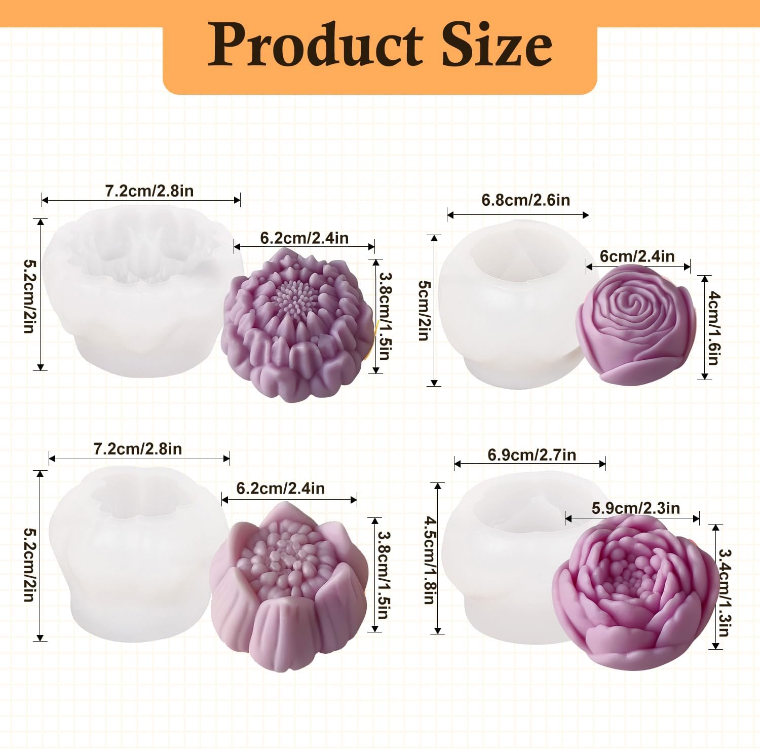 - 【4-In-1 Large Floral Variety】Craft stunning roses, lotuses, hibiscus, and peonies with this flower molds silicone set! Each silicone mold offers practical dimensions (check product images for exact sizing)—perfect for standard candles, soap bars, or cupcake toppers. The deep 3D textures capture petal details flawlessly, ideal for large candle making molds, wedding décor, and personalized gifts