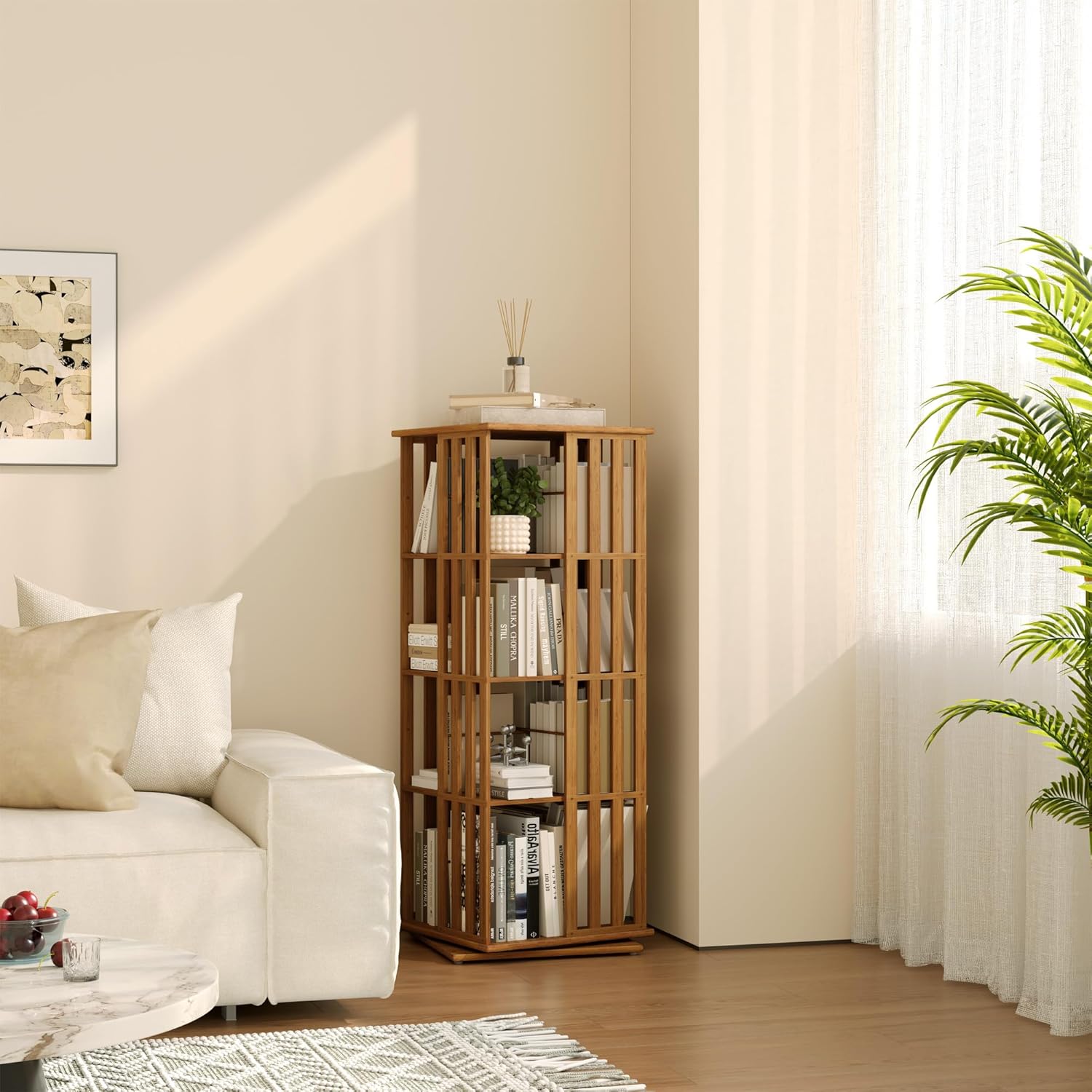 - 360° Rotating Bookshelf with Stable Base: Enjoy effortless organization with this rotating bookshelf tower—smooth 360° spin lets you find books, movies, or décor in seconds without bending or rearranging. The sturdy bamboo base and reinforced structure keep your spinning bookcase stable and wobble-free, even when fully loaded. Ideal for living rooms, bedrooms, home offices, or small apartments.
