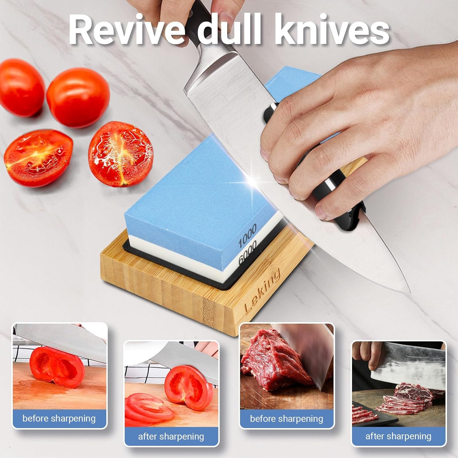 Leking Professional Knife Sharpener & Sharpening Stone Set: 1000/6000 Grit Dual-Sided Whetstone(7"x2.4"x1.2") with Bamboo Base, Non-Slip Silicone Holder, Angle Guide & Leather Strop Kit