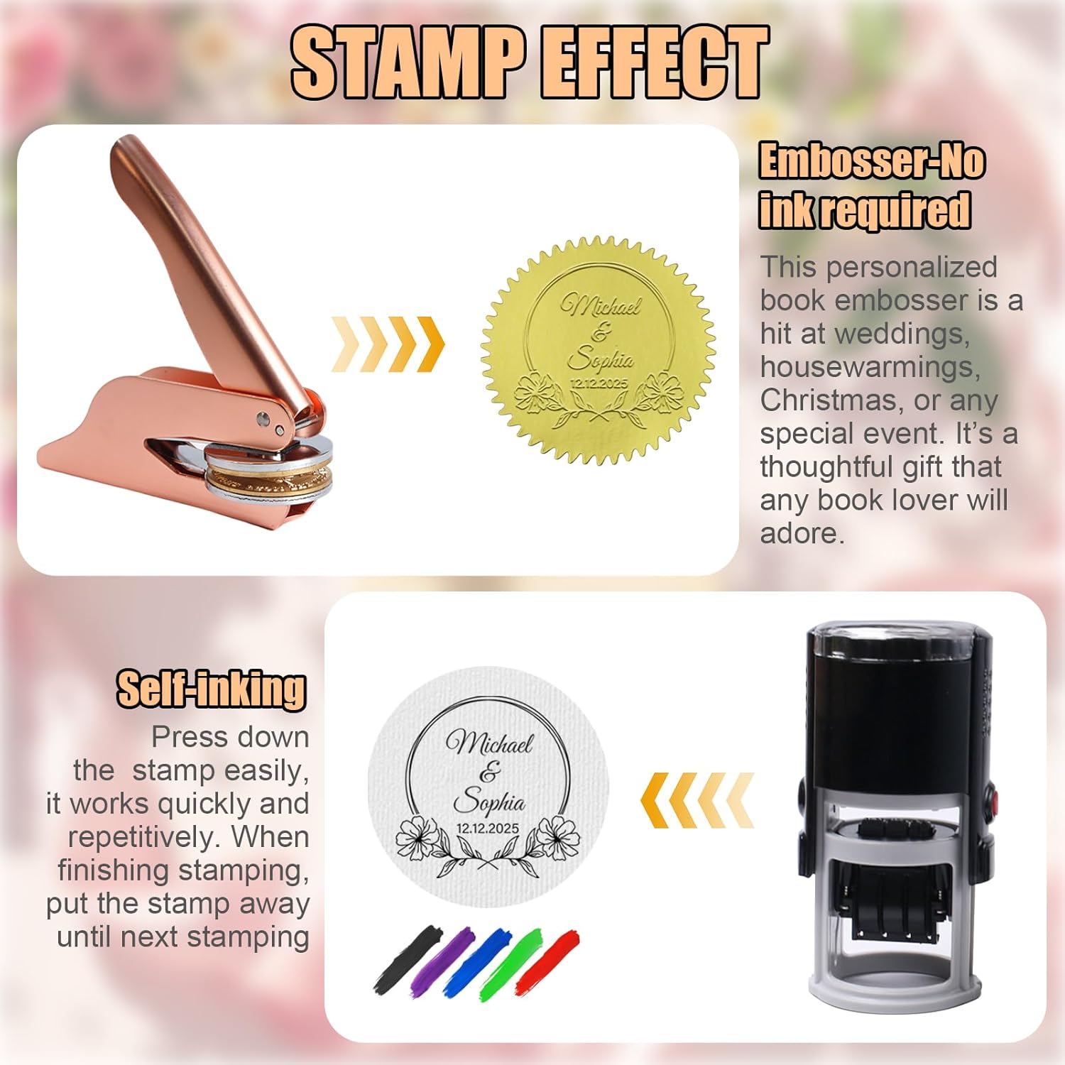 - 【Personalized Embosser Are So Easy】- Step 1: Choose a Book Embosser or Self Inking Stamp---> Step 2: Customize the text at the top and bottom of the input ---> Step 3: Options: Expedited Customization | Foil Stickers | Gift Box Packaging