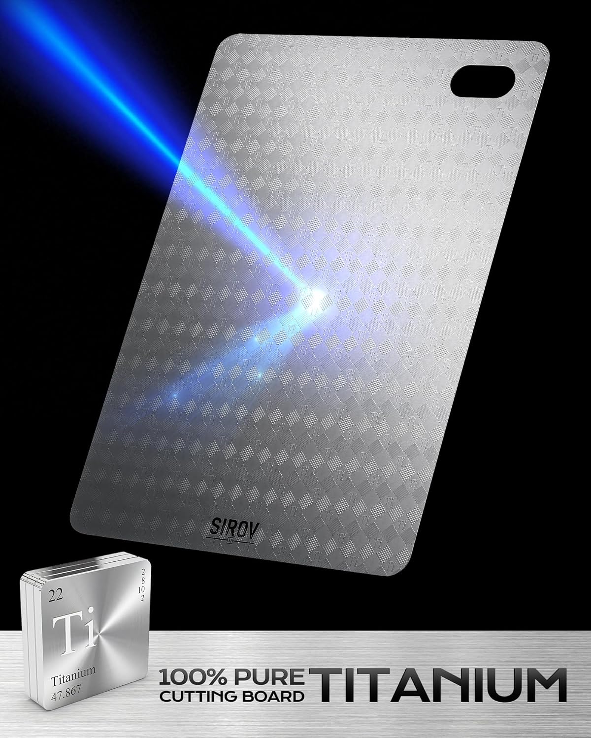 - [Elegant in Design]: A masterpiece of both functionality and aesthetics. Crafted from 100% pure titanium, it boasts a natural metallic luster that adds a touch of sophistication to any kitchen setting. Plus the unique chessboard pattern design which not only enhances its visual appeal but also provides a non-slip surface for more efficient food preparation. Our titanium cutting board is more than just a kitchen tool; it's an exquisite work of art that combines elegance with practicality.
