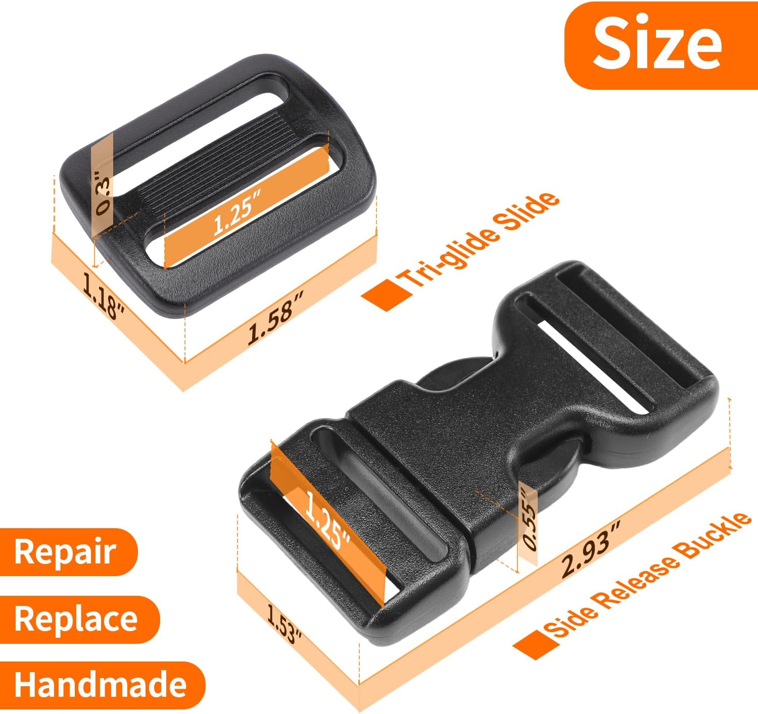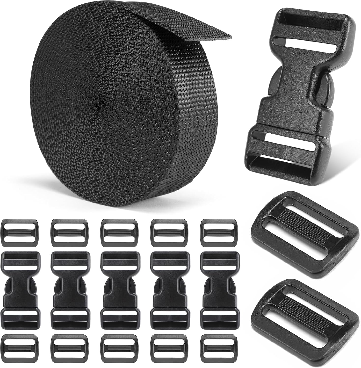Heavy-Duty Buckles and Strap Set 1-1/4": 6 Yards of Thick Nylon Webbing, 6-Pack Adjustable Quick Side Release Plastic Buckles, 12 Tri-Glide Slide Clips, Black (1 1/4 Inch Combo Set)